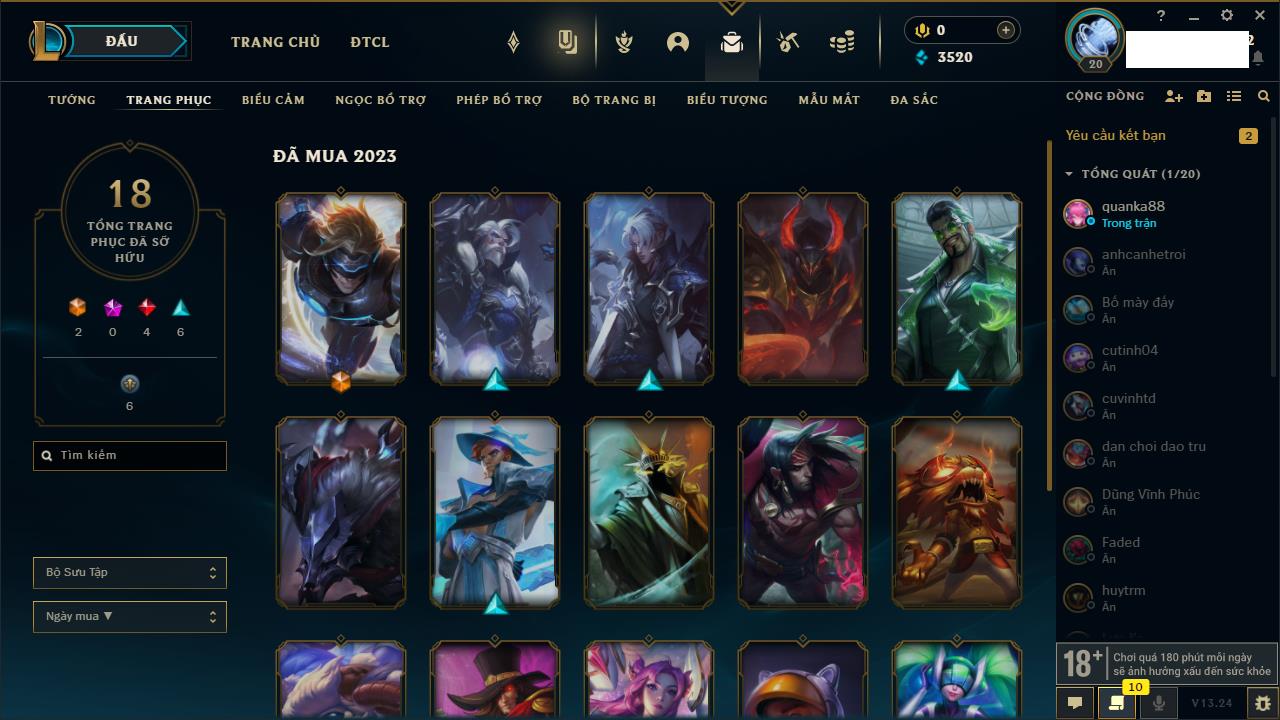 Rank Đơn: Chưa rank mùa nàoKhung: Chưa có khungTướng: 161 - Còn 3520 THXTrang Phục: 18Rank ĐTCL: Chưa RankLinh Thú: 32