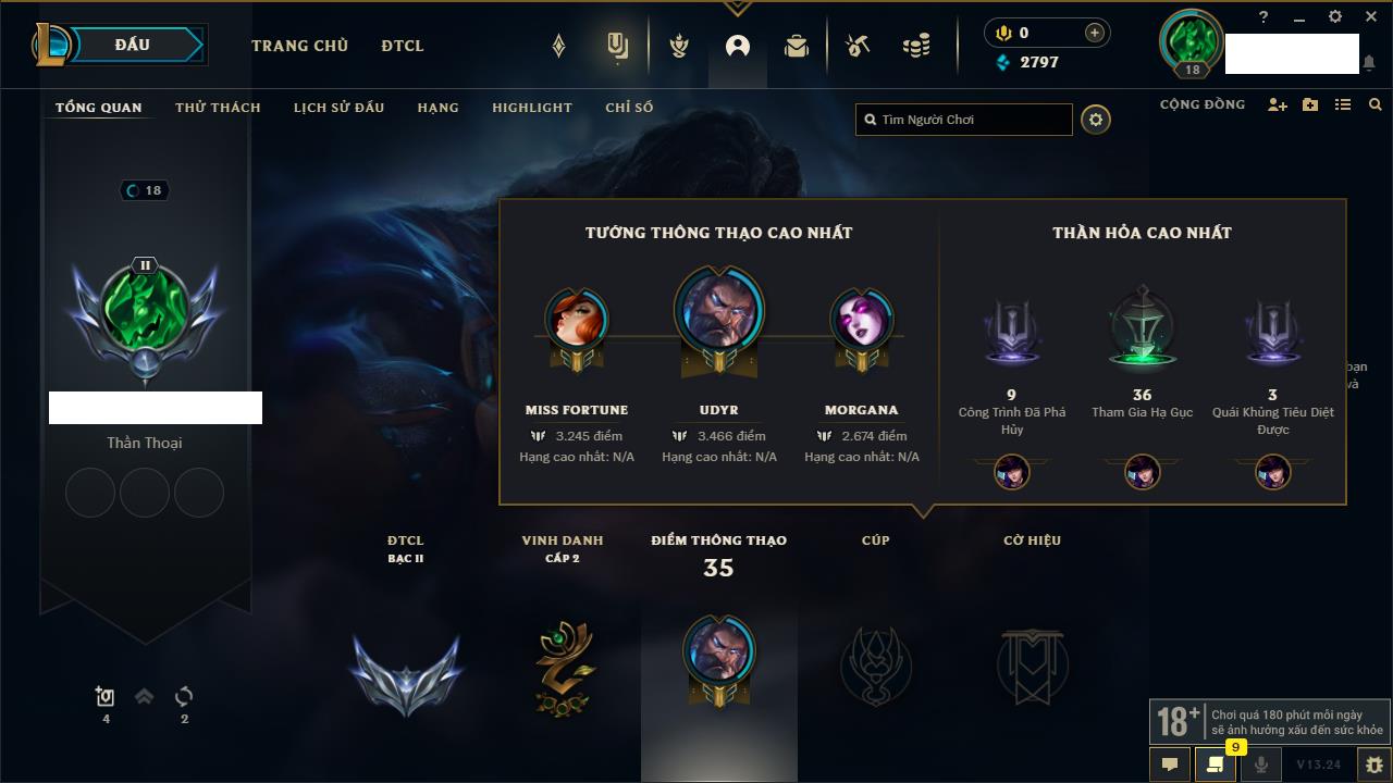 Rank Đơn: Chưa rank mùa nàoKhung: Chưa có khungTướng: 36 - Còn 190 THXTrang Phục: 14Rank ĐTCL: Chưa RankLinh Thú: 65
