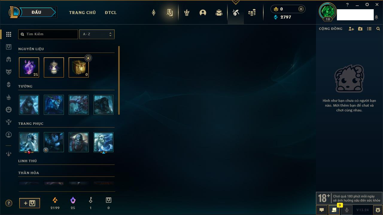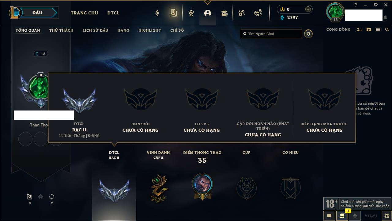 Rank Đơn: Chưa rank mùa nàoKhung: Chưa có khungTướng: 12 - Còn 3853 THXTrang Phục: 2Rank ĐTCL: Chưa RankLinh Thú: 30
