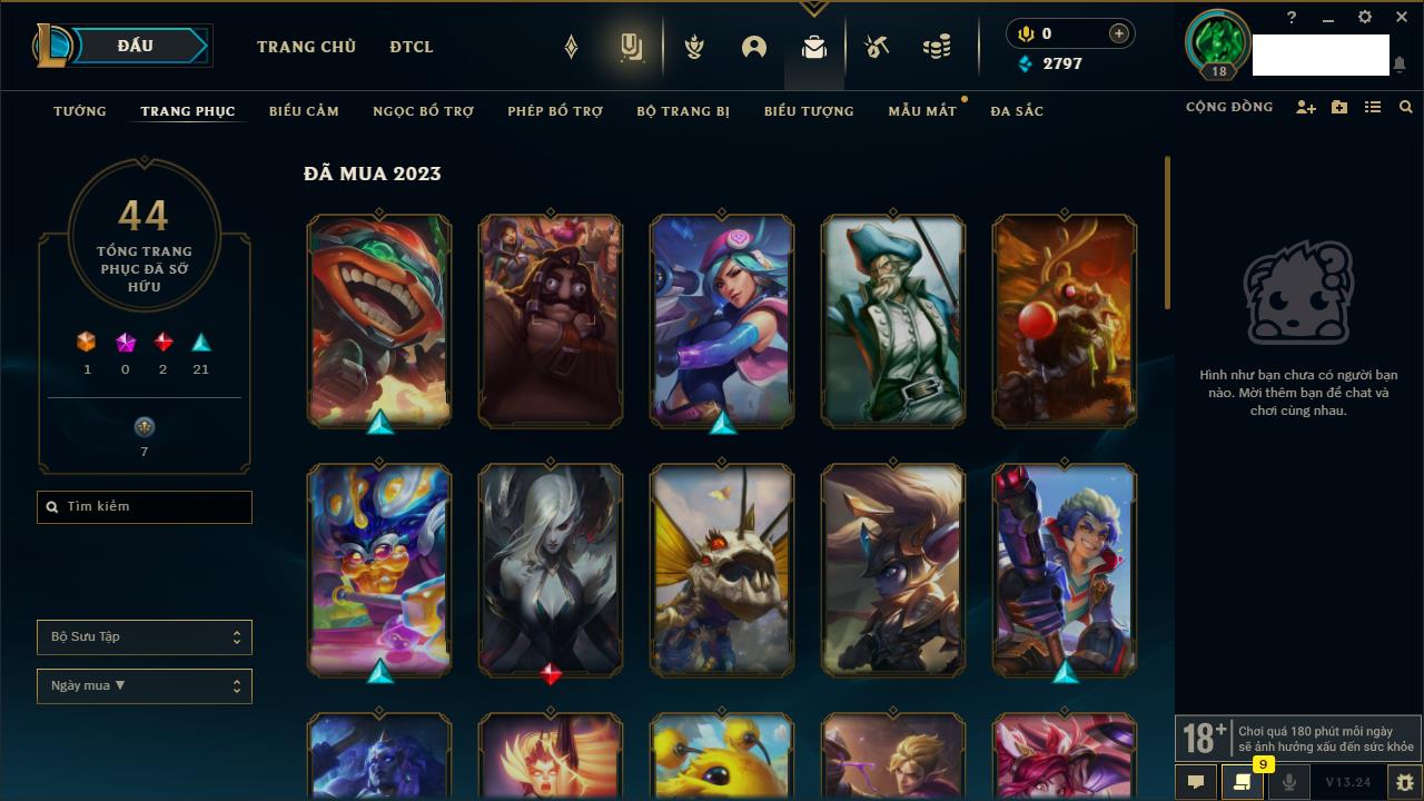 Rank Đơn: Chưa rank mùa nàoKhung: Chưa có khungTướng: 158 - Còn 6970 THXTrang Phục: 32Rank ĐTCL: Chưa RankLinh Thú: 24