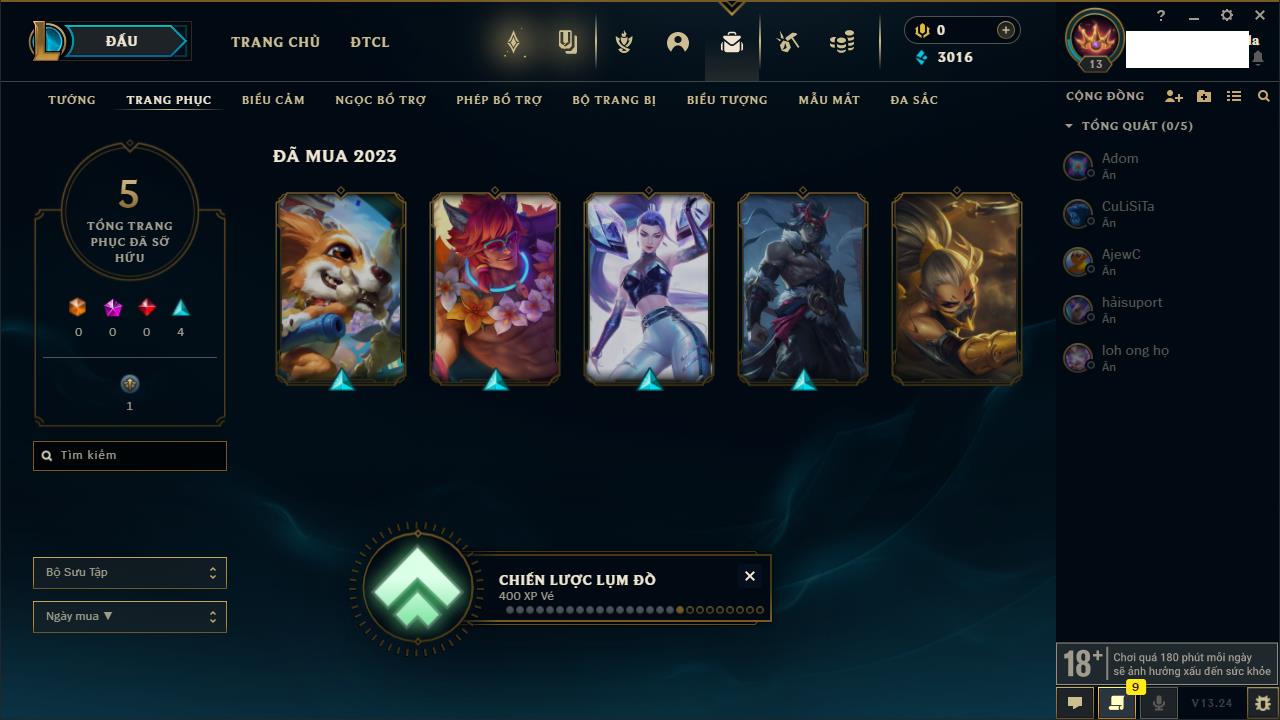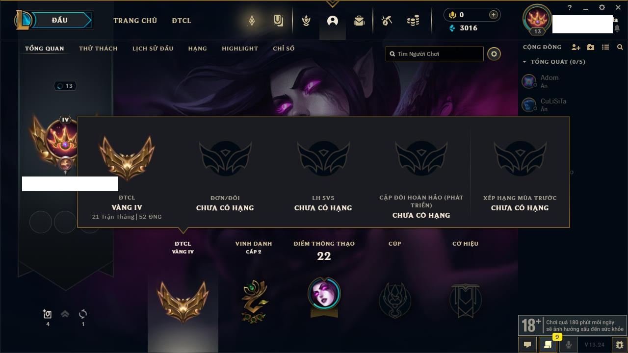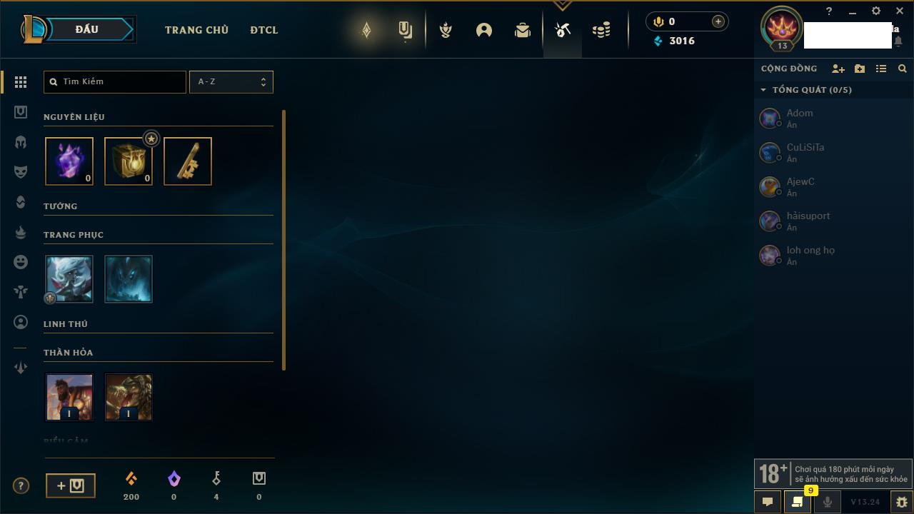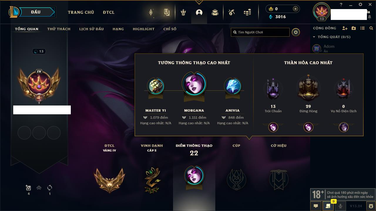 Rank Đơn: Chưa rank mùa nàoKhung: Chưa có khungTướng: 161 - Còn 11380 THXTrang Phục: 13Rank ĐTCL: Chưa RankLinh Thú: 74