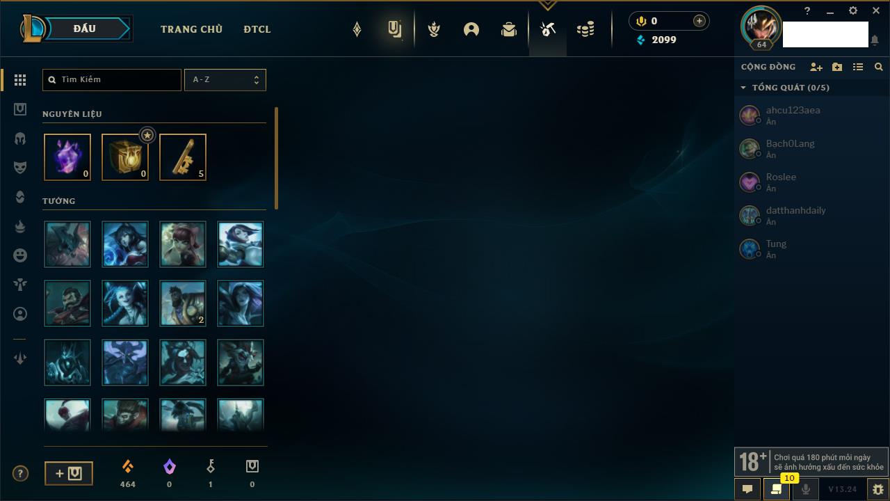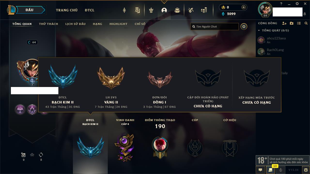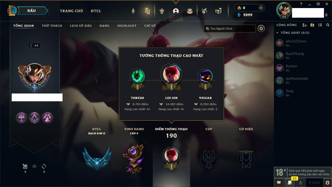 Rank Đơn: Chưa rank mùa nàoKhung: Chưa có khungTướng: 36 - Còn 190 THXTrang Phục: 14Rank ĐTCL: Chưa RankLinh Thú: 65