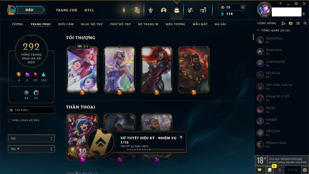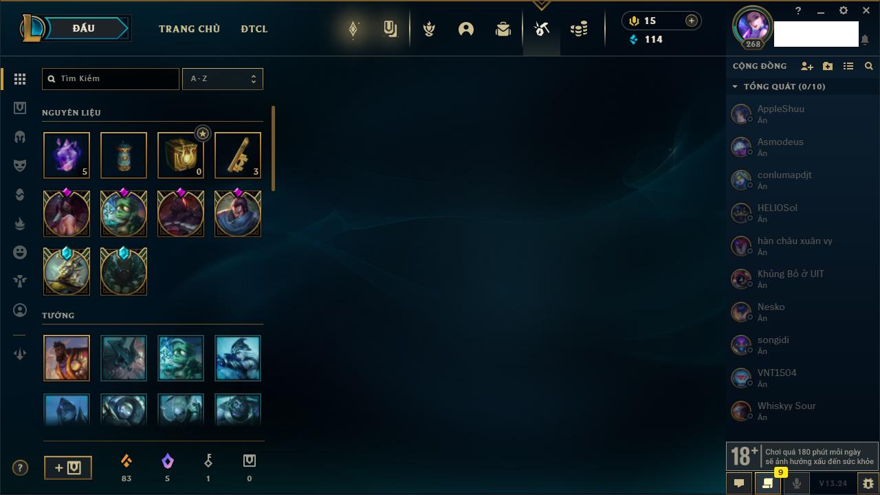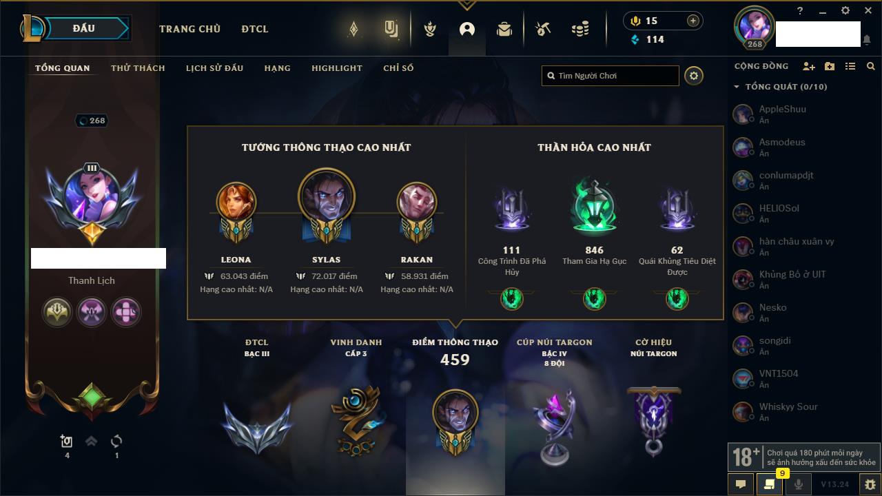 Rank Đơn: Bạc IIIKhung: BạcTướng: 170 - Còn 42417 THXTrang Phục: 262Rank ĐTCL: Chưa RankLinh Thú: 132