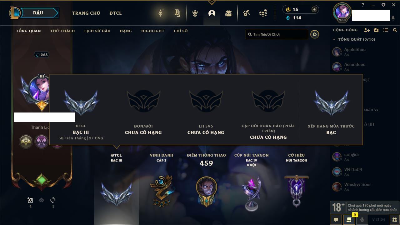 Rank Đơn: Bạch Kim IIIKhung: Bạch kimTướng: 170 - Còn 66107 THXTrang Phục: 201Rank ĐTCL: Chưa RankLinh Thú: 83