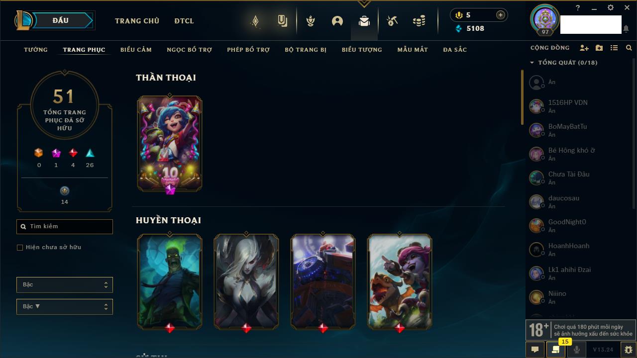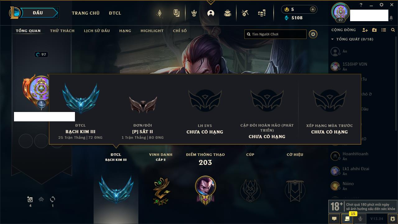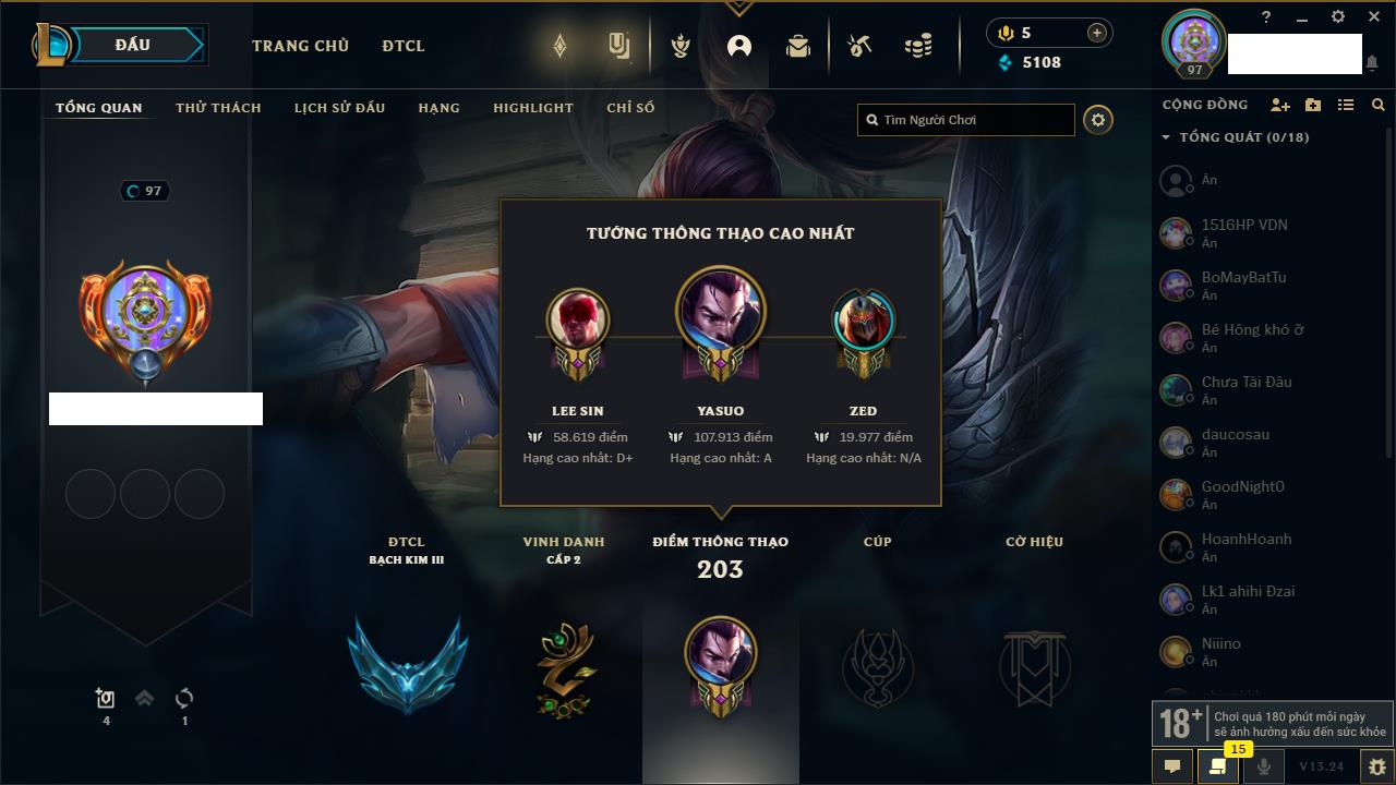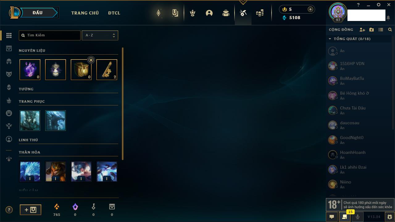 Rank Đơn: Chưa rank mùa nàoKhung: Chưa có khungTướng: 158 - Còn 6970 THXTrang Phục: 32Rank ĐTCL: Chưa RankLinh Thú: 24