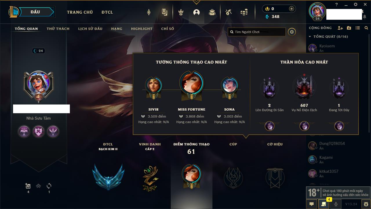 Rank Đơn: Chưa rank mùa nàoKhung: Chưa có khungTướng: 12 - Còn 3853 THXTrang Phục: 2Rank ĐTCL: Chưa RankLinh Thú: 30