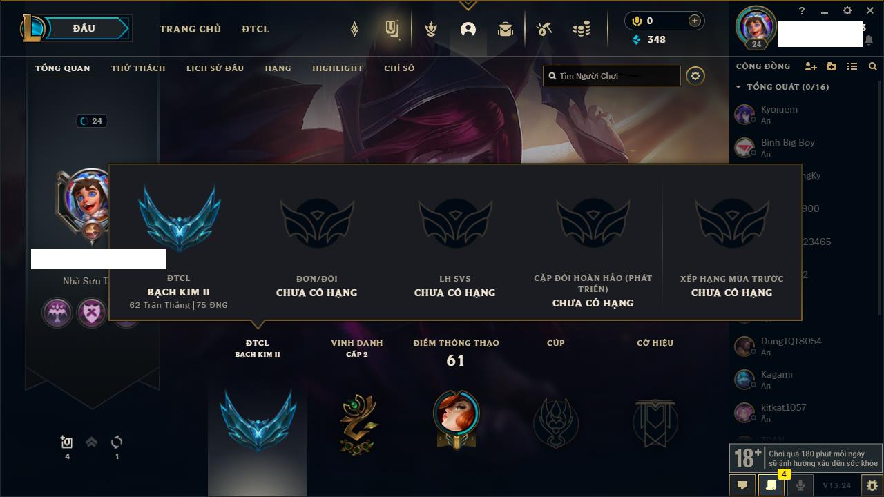 Rank Đơn: Chưa rank mùa nàoKhung: Chưa có khungTướng: 36 - Còn 190 THXTrang Phục: 14Rank ĐTCL: Chưa RankLinh Thú: 65