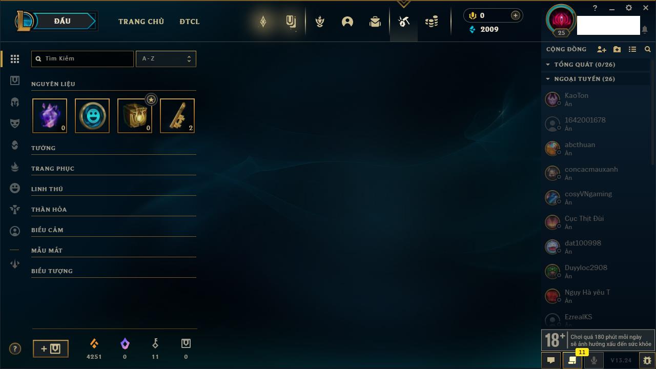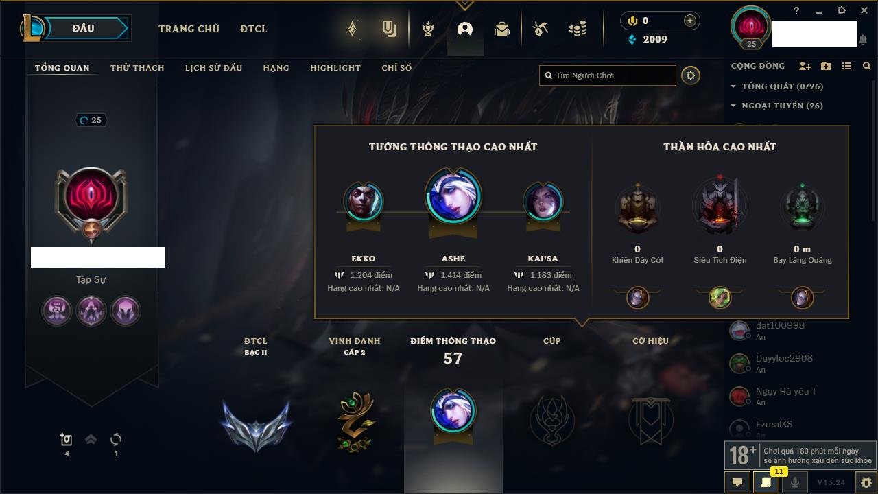 Rank Đơn: Chưa rank mùa nàoKhung: Chưa có khungTướng: 12 - Còn 3853 THXTrang Phục: 2Rank ĐTCL: Chưa RankLinh Thú: 30