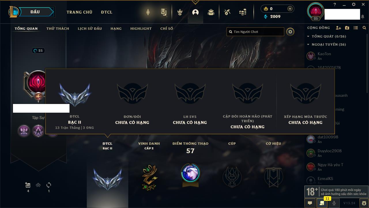 Rank Đơn: Chưa rank mùa nàoKhung: Chưa có khungTướng: 166 - Còn 9615 THXTrang Phục: 26Rank ĐTCL: Chưa RankLinh Thú: 27