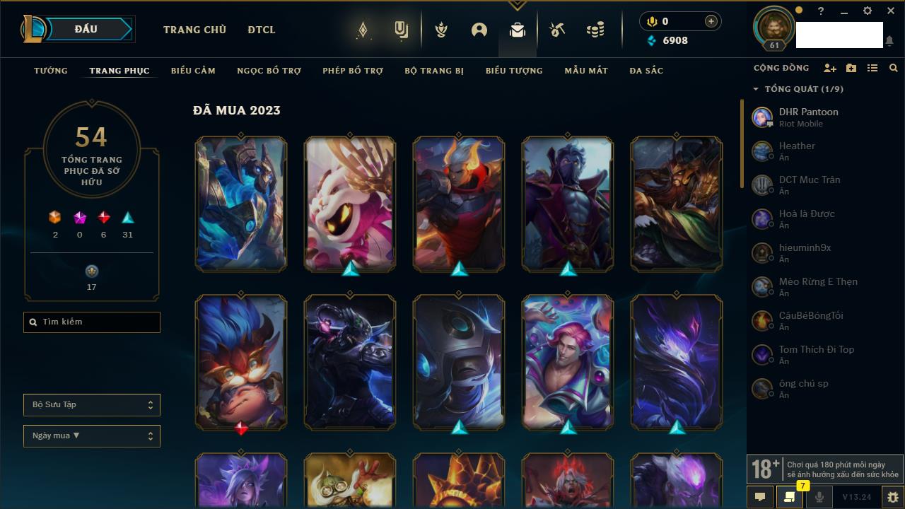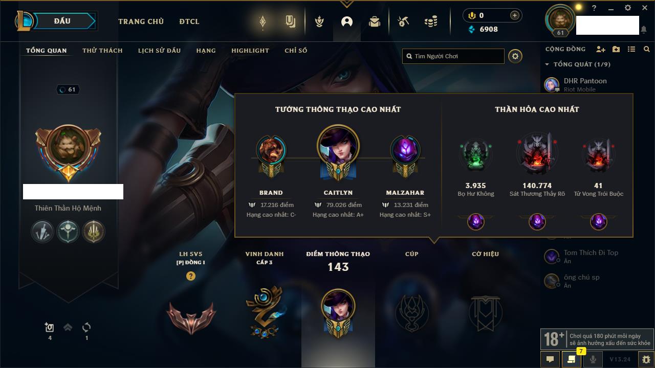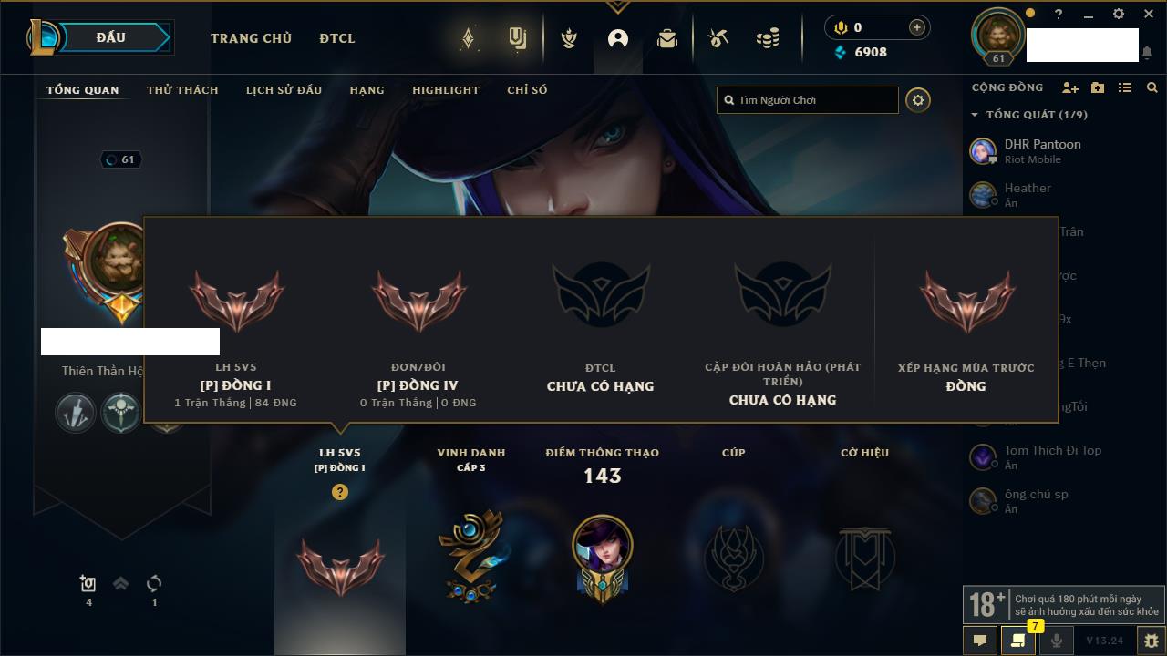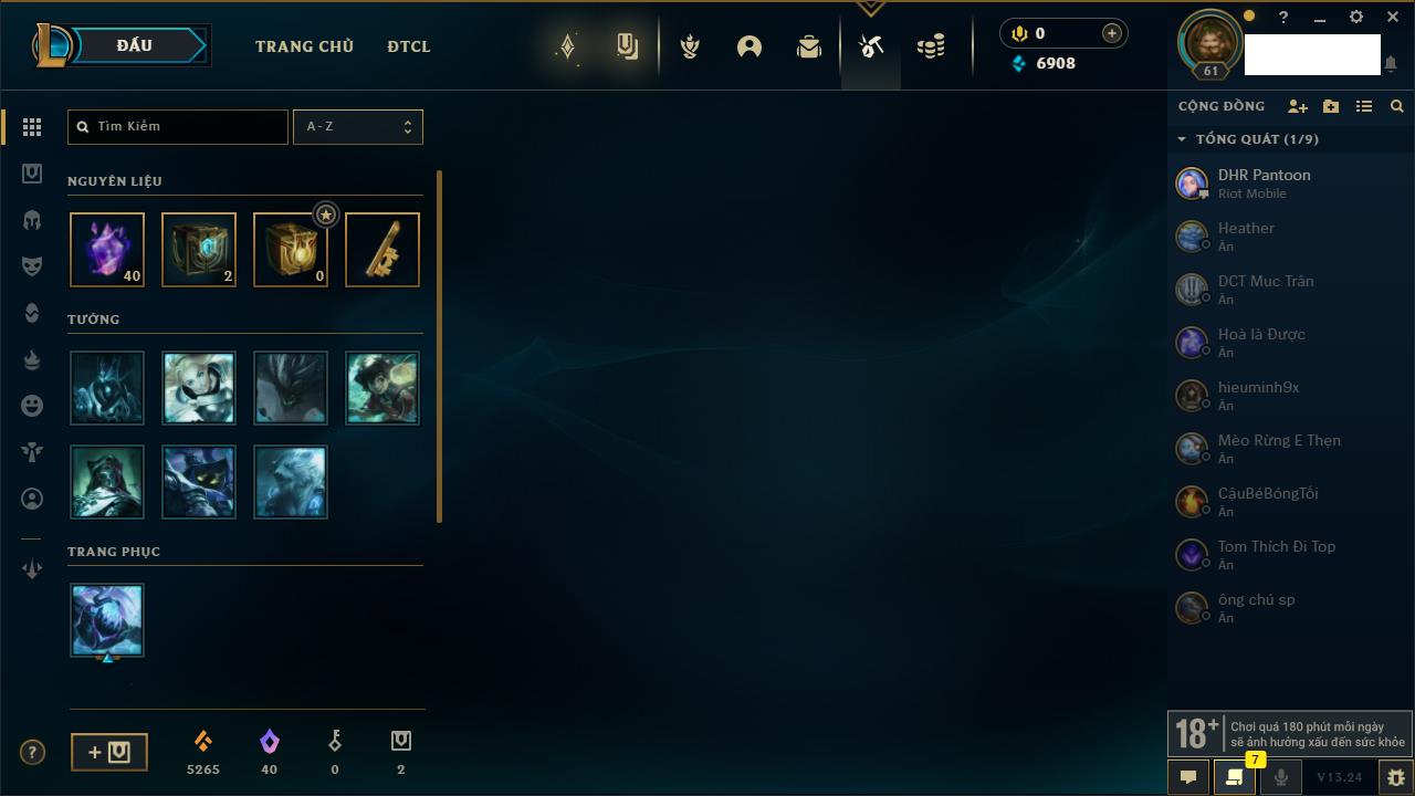 Rank Đơn: Chưa rank mùa nàoKhung: Chưa có khungTướng: 158 - Còn 6970 THXTrang Phục: 32Rank ĐTCL: Chưa RankLinh Thú: 24