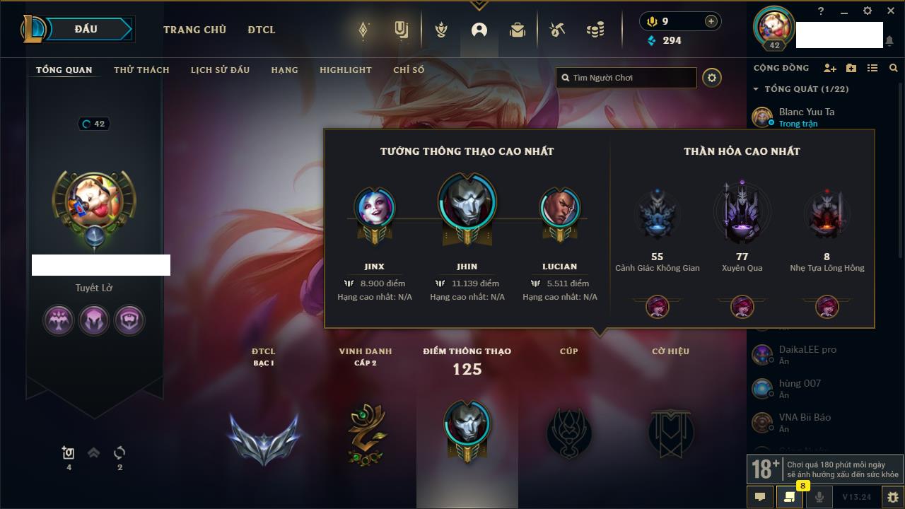 Rank Đơn: Chưa rank mùa nàoKhung: Chưa có khungTướng: 12 - Còn 3853 THXTrang Phục: 2Rank ĐTCL: Chưa RankLinh Thú: 30
