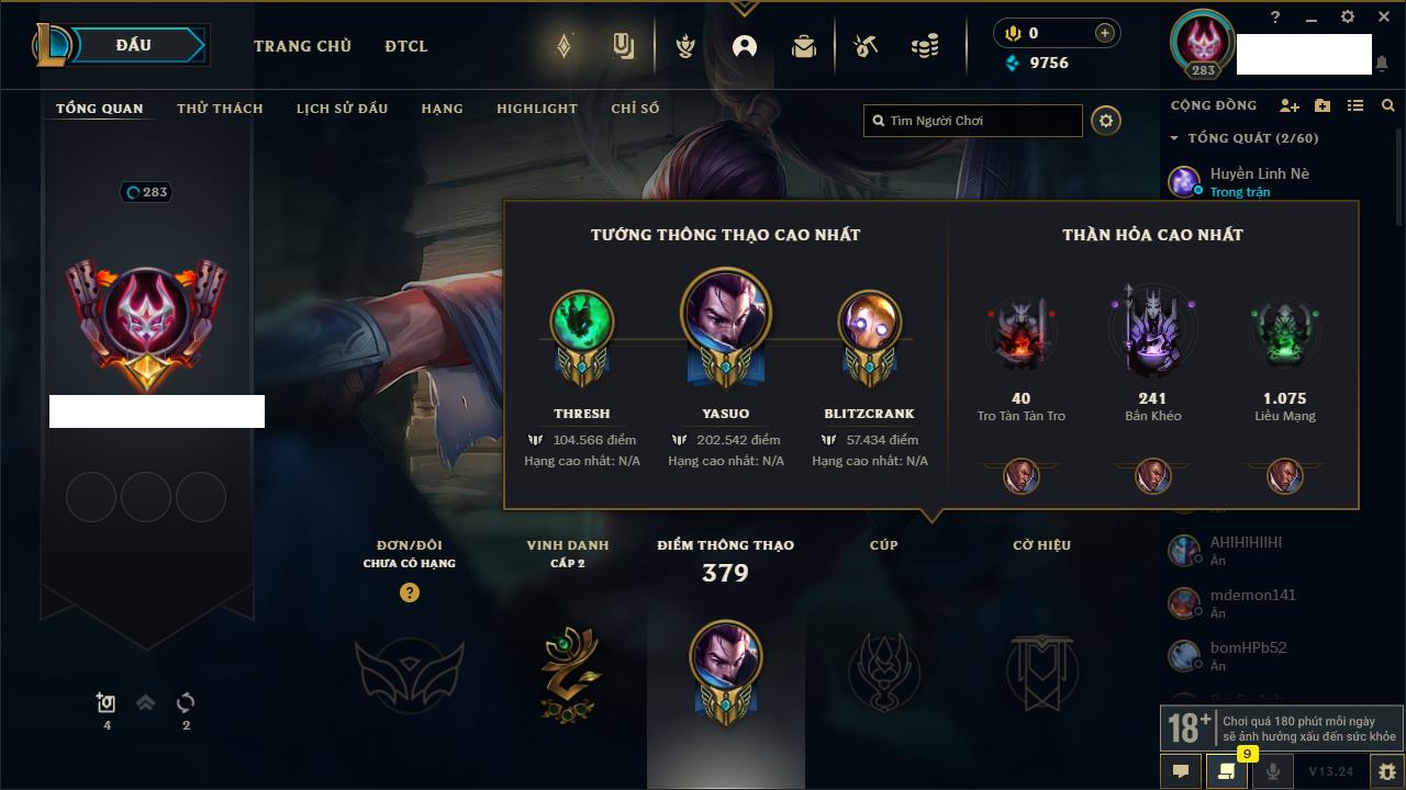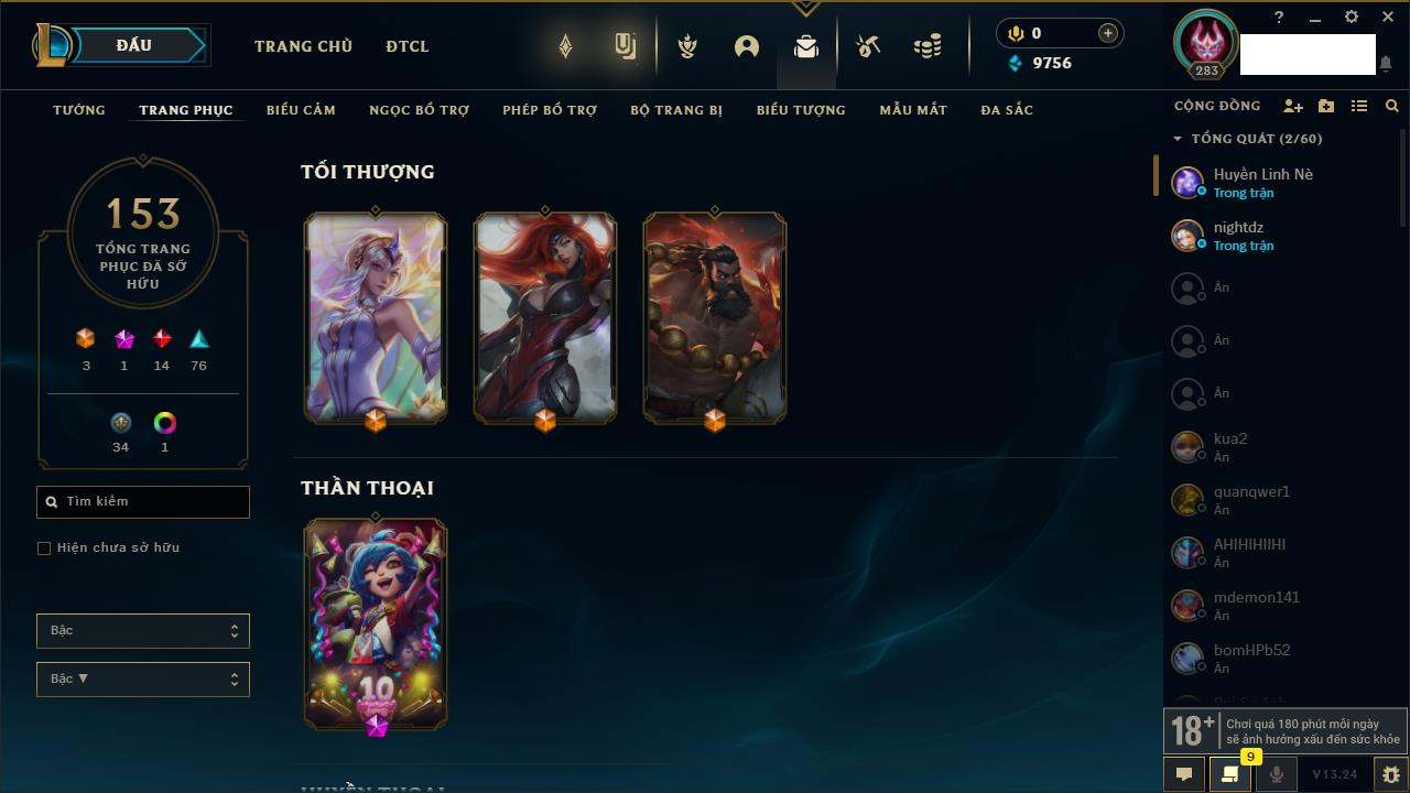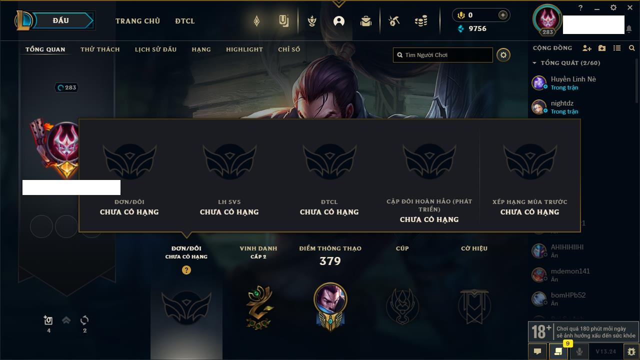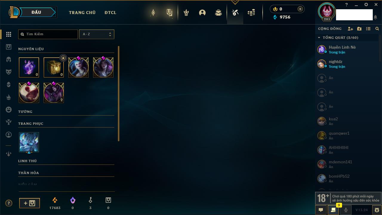 Rank Đơn: Đồng IIKhung: Chưa có khungTướng: 170 - Còn 56487 THXTrang Phục: 90Rank ĐTCL: Chưa RankLinh Thú: 129