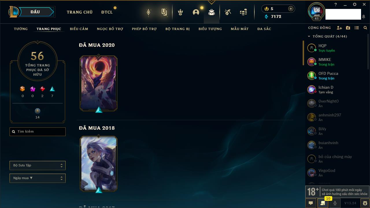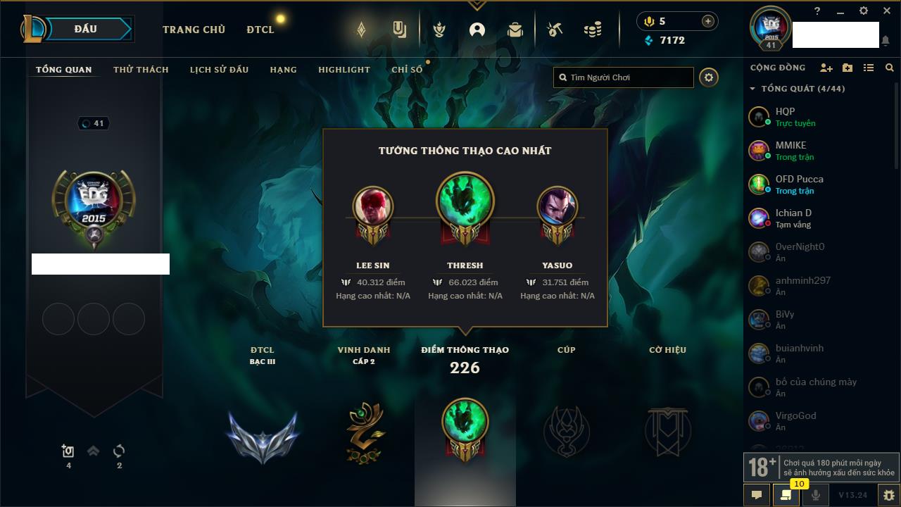 Rank Đơn: Chưa rank mùa nàoKhung: Chưa có khungTướng: 157 - Còn 14250 THXTrang Phục: 3Rank ĐTCL: Chưa RankLinh Thú: 56