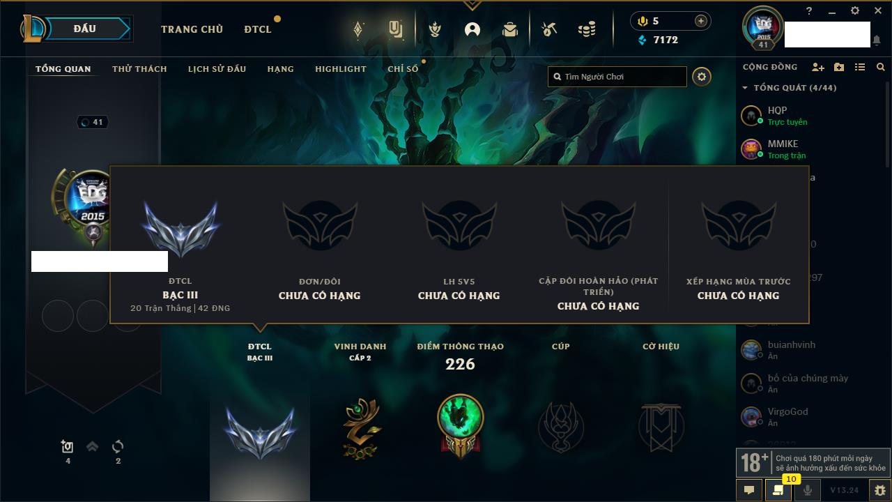 Rank Đơn: Chưa rank mùa nàoKhung: Chưa có khungTướng: 0 - Còn 9000 THXTrang Phục: 0Rank ĐTCL: Bạc IILinh Thú: 13