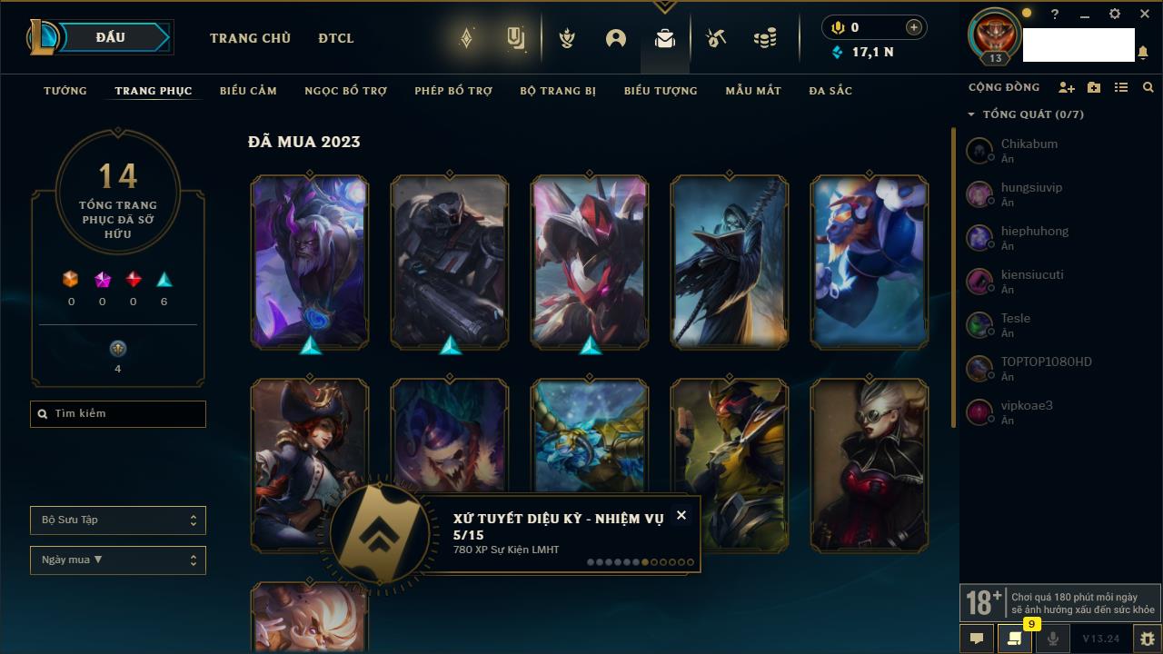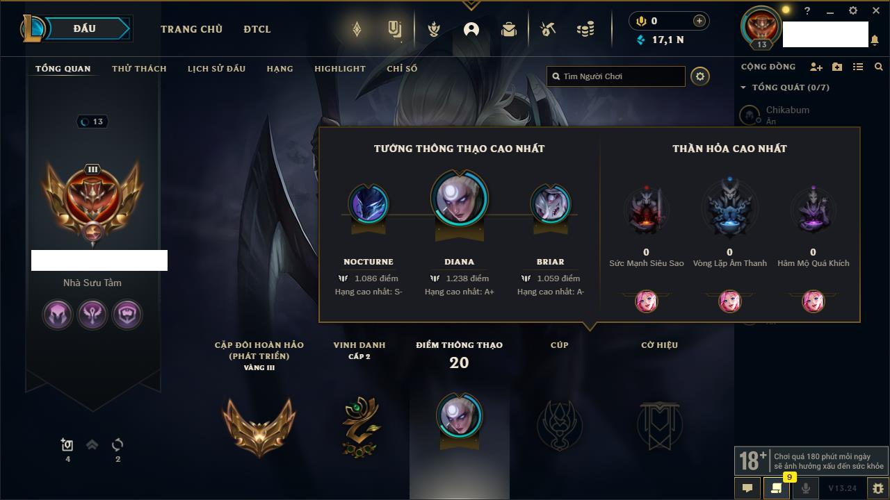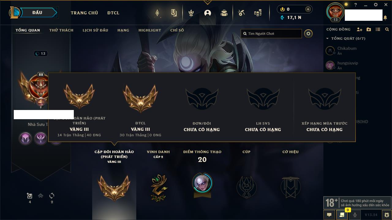 Rank Đơn: Chưa rank mùa nàoKhung: Chưa có khungTướng: 161 - Còn 11380 THXTrang Phục: 13Rank ĐTCL: Chưa RankLinh Thú: 74