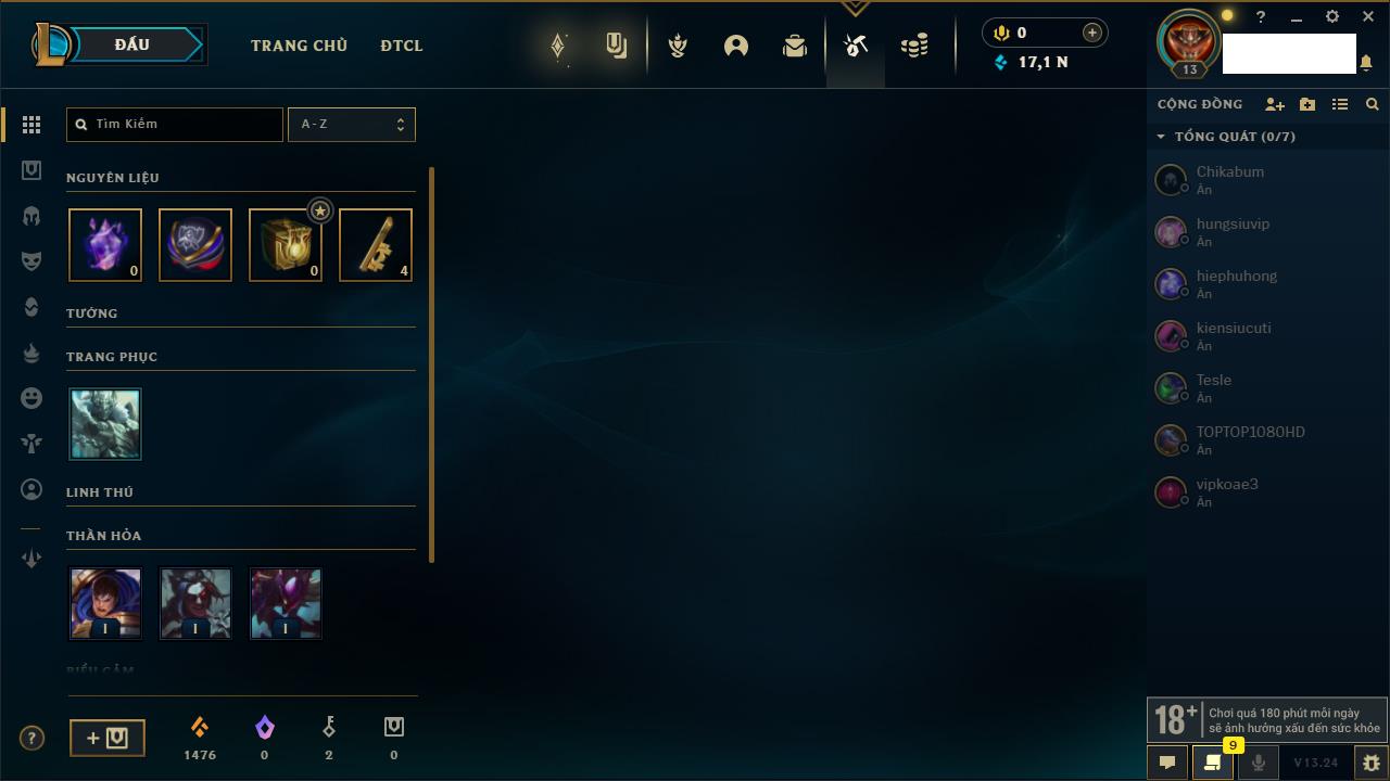 Rank Đơn: Chưa rank mùa nàoKhung: Chưa có khungTướng: 157 - Còn 8409 THXTrang Phục: 12Rank ĐTCL: Chưa RankLinh Thú: 74