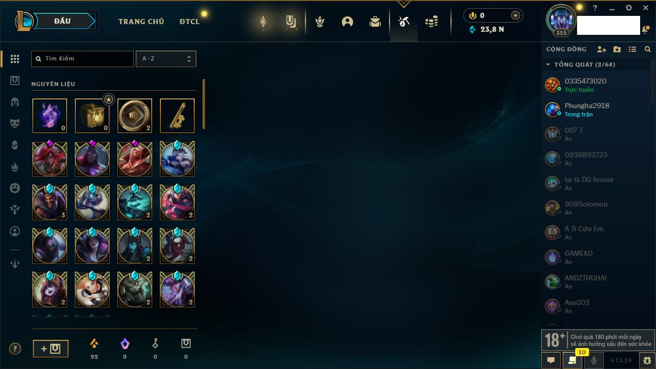 Rank Đơn: Chưa Rank Khung: Chưa có khung Tướng: 163 - Còn 20227 THX Trang Phục: 299 Rank ĐTCL: Chưa Rank Linh Thú: 78