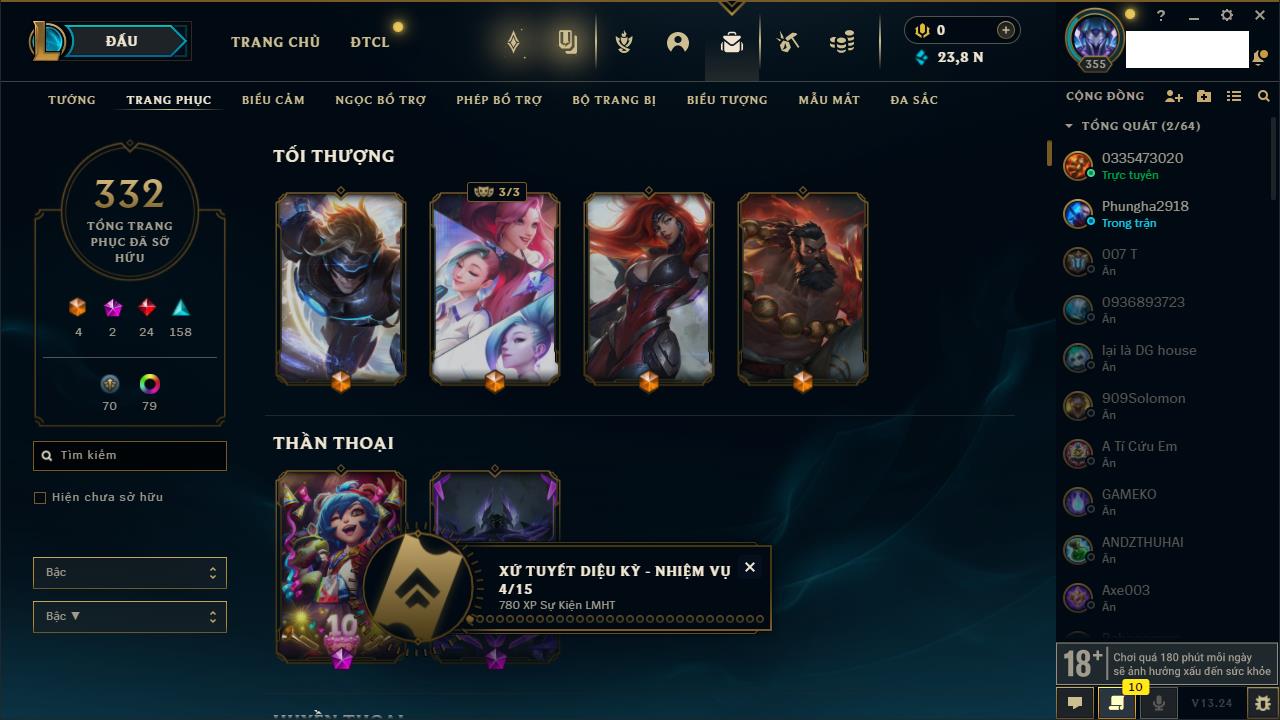Rank Đơn: Chưa Rank Khung: Chưa có khung Tướng: 162 - Còn 23894 THX Trang Phục: 332 Rank ĐTCL: Chưa Rank Linh Thú: 59