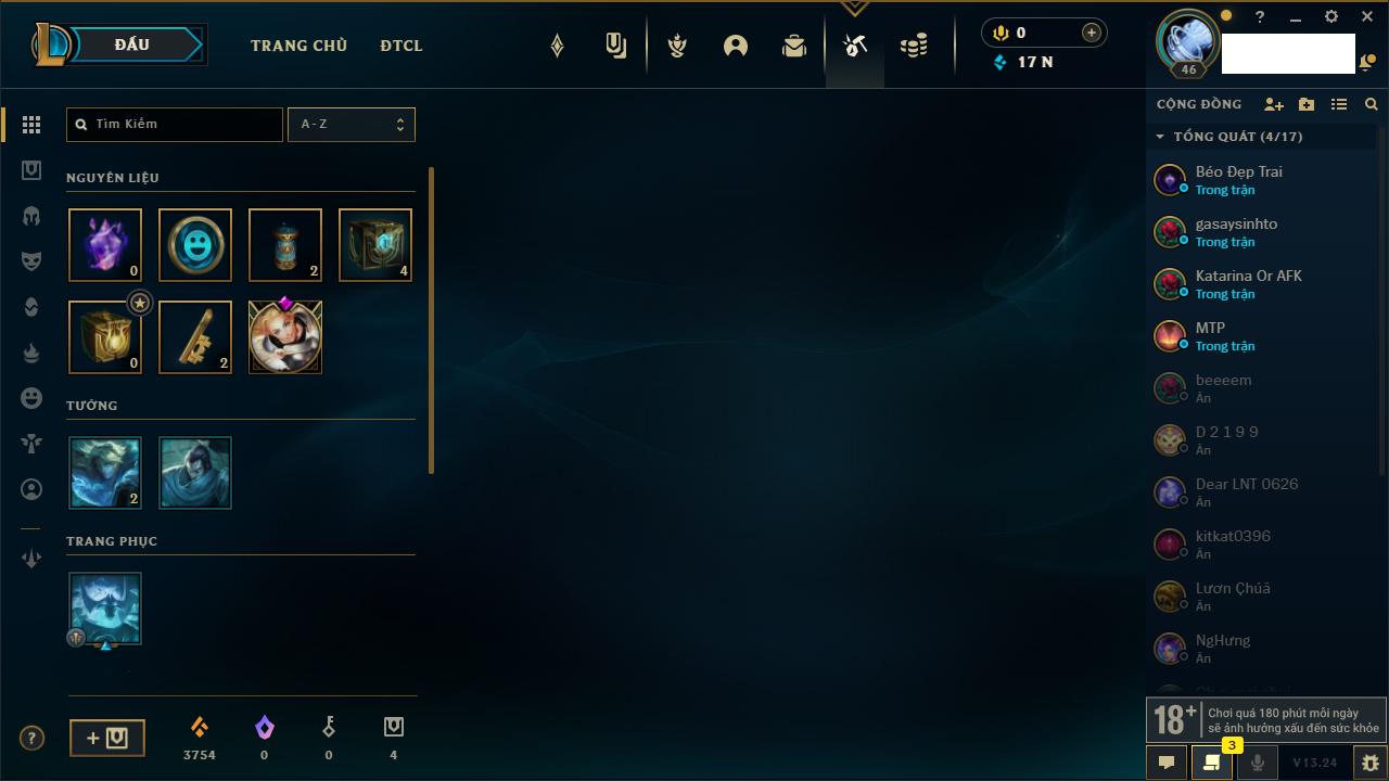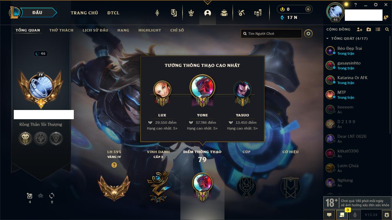 Rank Đơn: Chưa rank mùa nàoKhung: Chưa có khungTướng: 12 - Còn 3853 THXTrang Phục: 2Rank ĐTCL: Chưa RankLinh Thú: 30