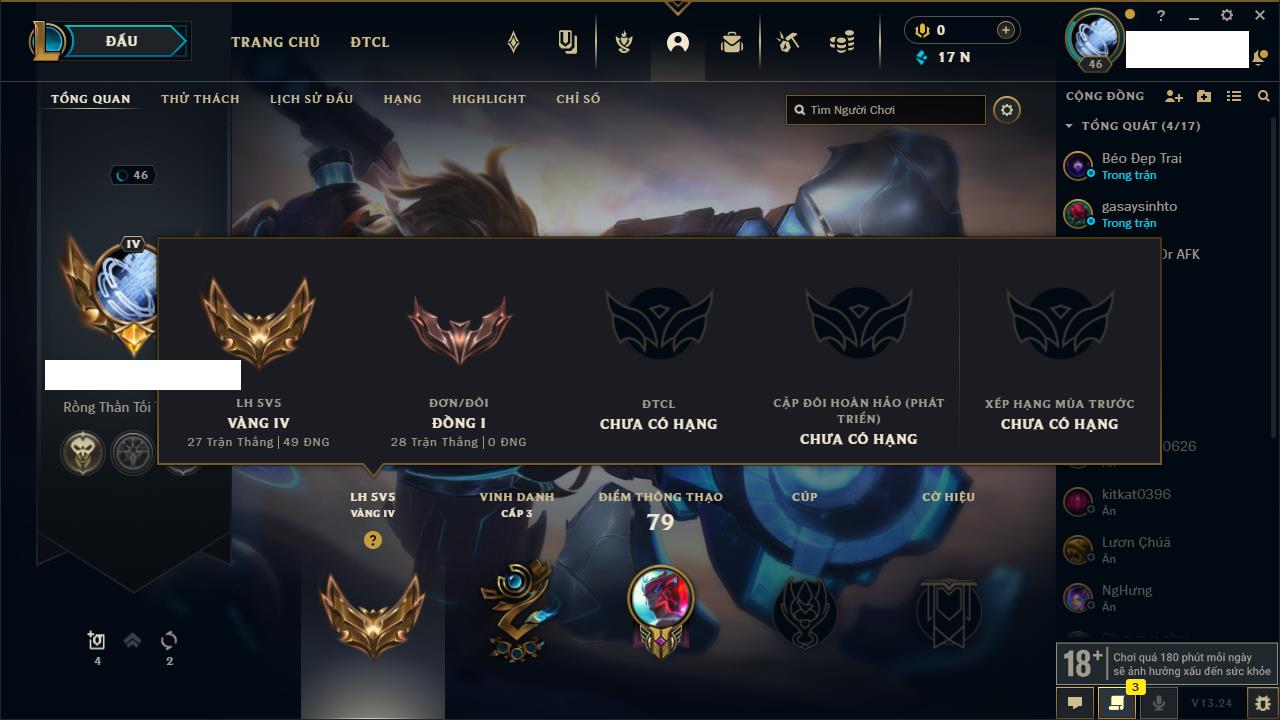 Rank Đơn: Chưa rank mùa nàoKhung: Chưa có khungTướng: 166 - Còn 9615 THXTrang Phục: 26Rank ĐTCL: Chưa RankLinh Thú: 27