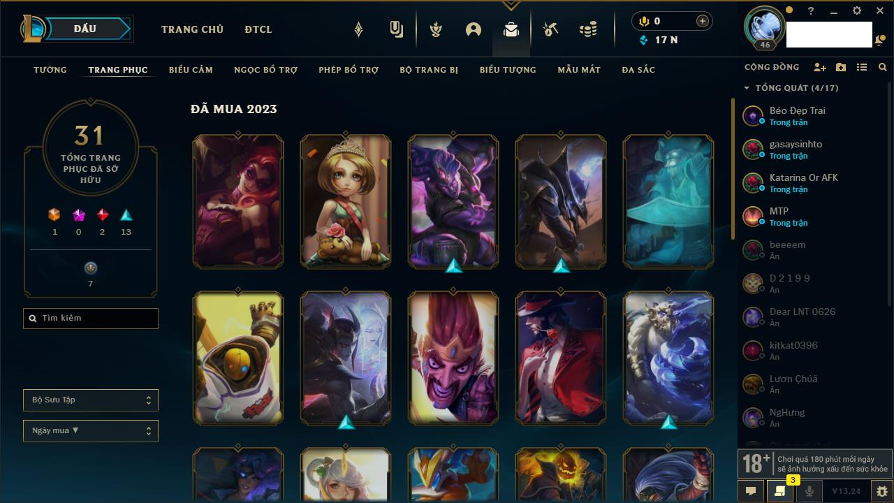 Rank Đơn: Chưa rank mùa nàoKhung: Chưa có khungTướng: 158 - Còn 6970 THXTrang Phục: 32Rank ĐTCL: Chưa RankLinh Thú: 24