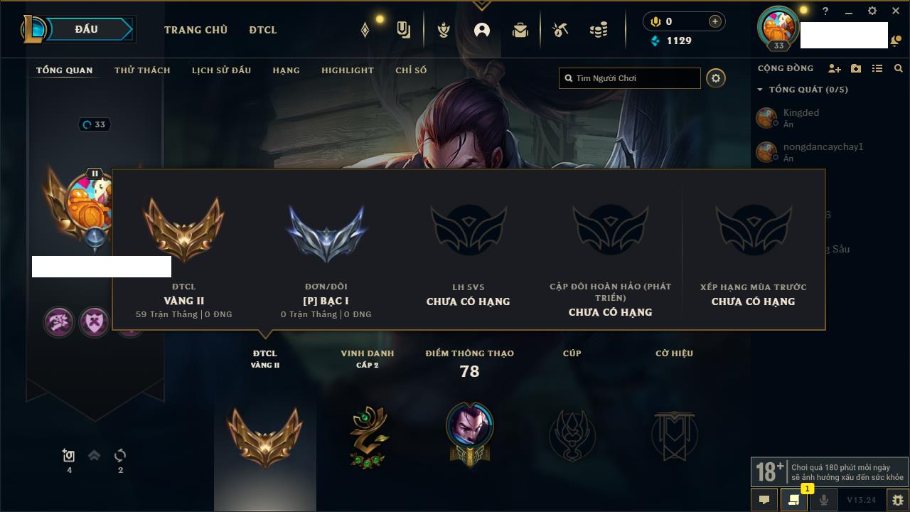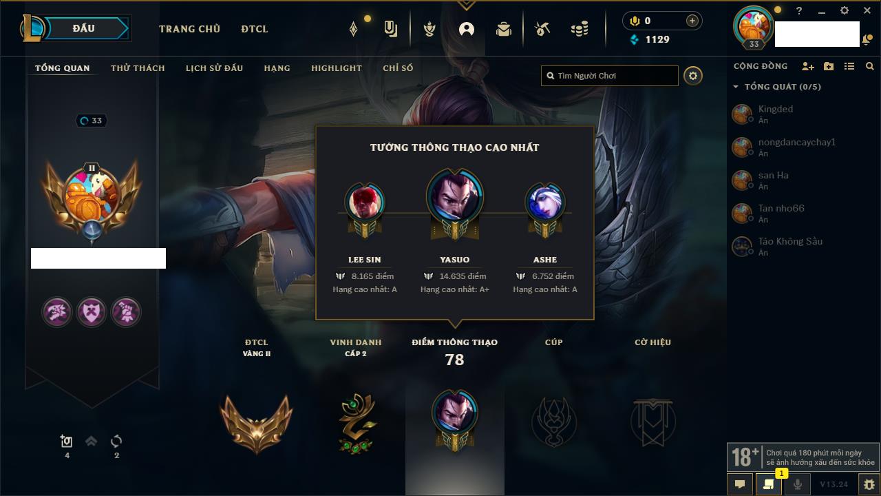 Rank Đơn: Chưa rank mùa nàoKhung: Chưa có khungTướng: 36 - Còn 190 THXTrang Phục: 14Rank ĐTCL: Chưa RankLinh Thú: 65
