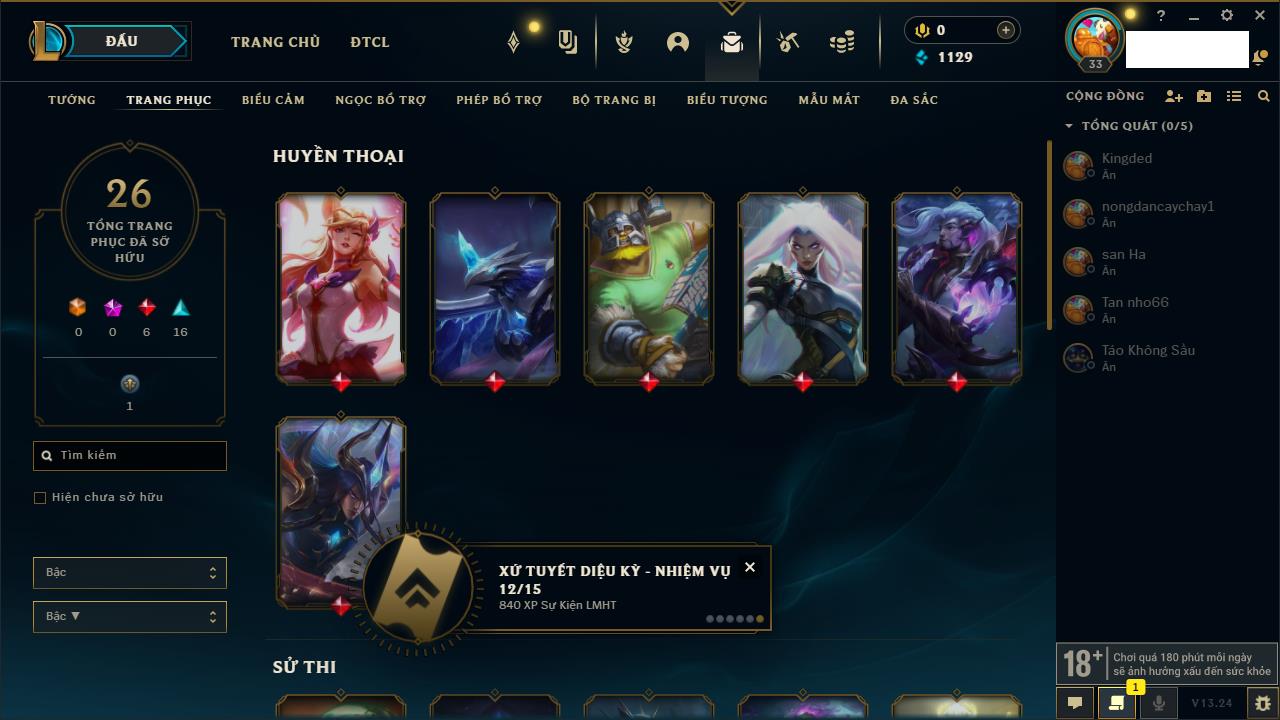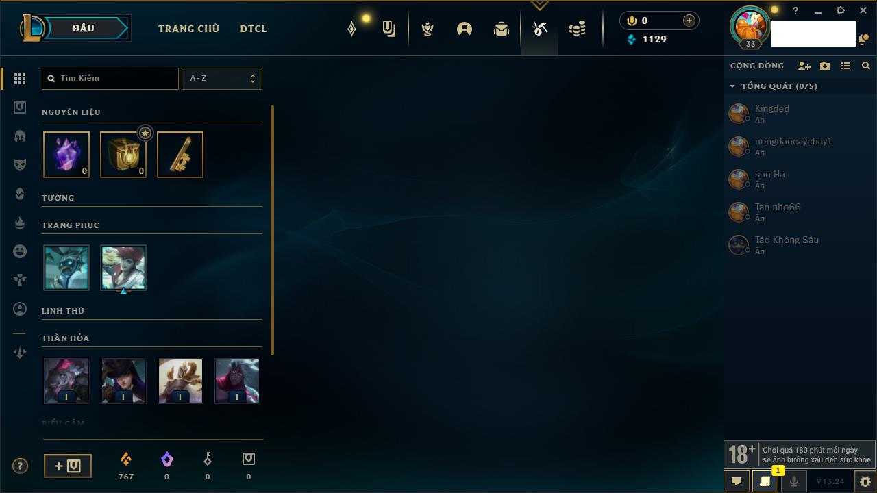 Rank Đơn: Chưa rank mùa nàoKhung: Chưa có khungTướng: 12 - Còn 3853 THXTrang Phục: 2Rank ĐTCL: Chưa RankLinh Thú: 30