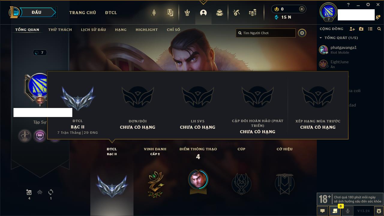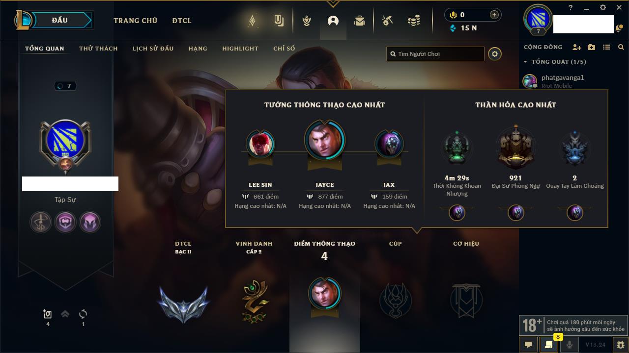 Rank Đơn: Chưa rank mùa nàoKhung: Chưa có khungTướng: 156 - Còn 18550 THXTrang Phục: 4Rank ĐTCL: Chưa RankLinh Thú: 75