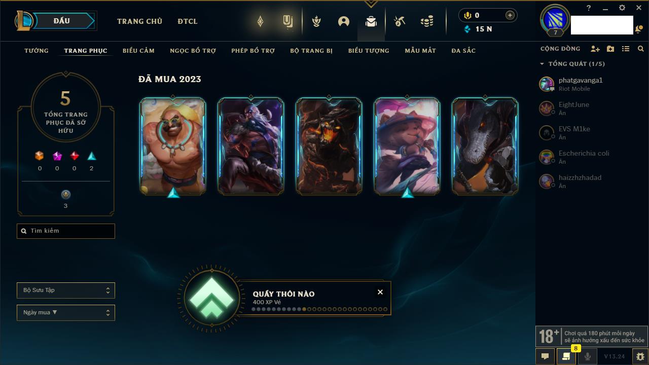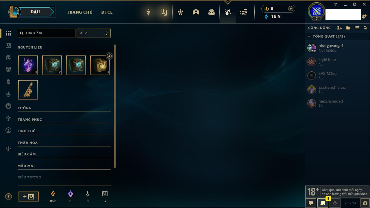 Rank Đơn: Chưa rank mùa nàoKhung: Chưa có khungTướng: 159 - Còn 15030 THXTrang Phục: 5Rank ĐTCL: Chưa RankLinh Thú: 51