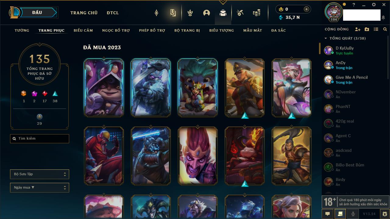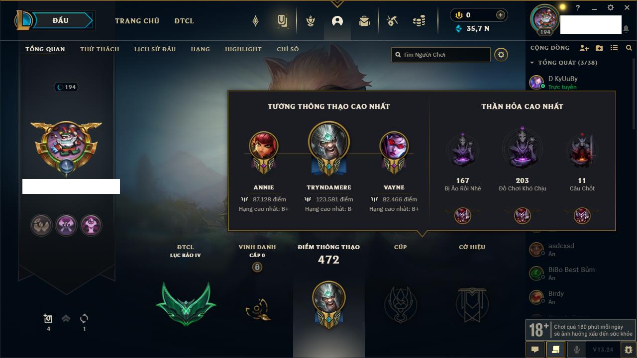 Rank Đơn: Chưa RankKhung: Chưa có khungTướng: 163 - Còn 35750 THXTrang Phục: 135Rank ĐTCL: Chưa RankLinh Thú: 78