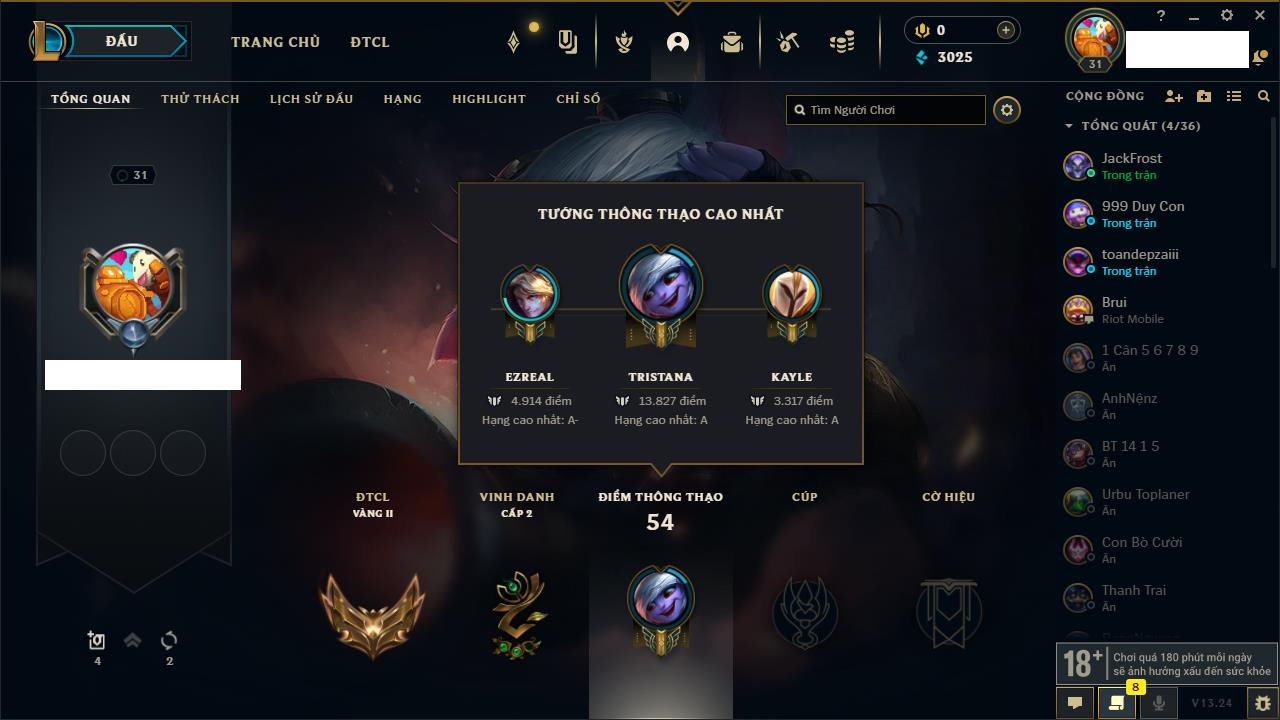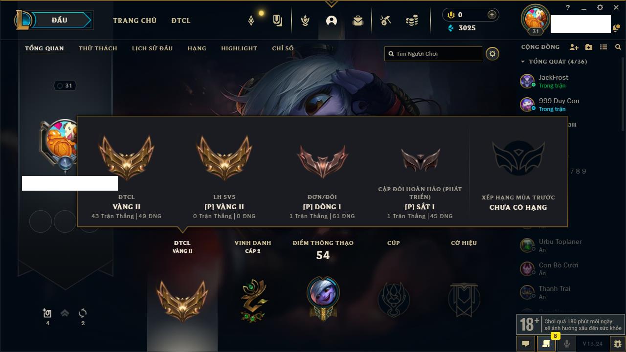 Rank Đơn: Chưa rank mùa nàoKhung: Chưa có khungTướng: 12 - Còn 3853 THXTrang Phục: 2Rank ĐTCL: Chưa RankLinh Thú: 30