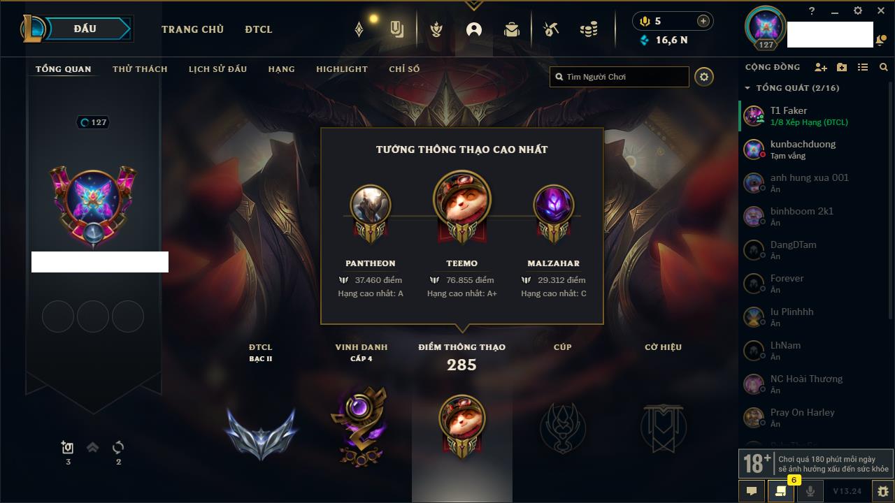Rank Đơn: Bạch Kim IVKhung: Bạch kimTướng: 151 - Còn 16486 THXTrang Phục: 62Rank ĐTCL: Chưa RankLinh Thú: 12