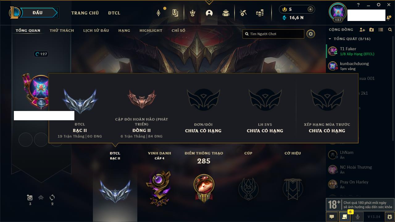 Rank Đơn: Bạch Kim IIIKhung: ĐồngTướng: 131 - Còn 3780 THXTrang Phục: 53Rank ĐTCL: Chưa RankLinh Thú: 4