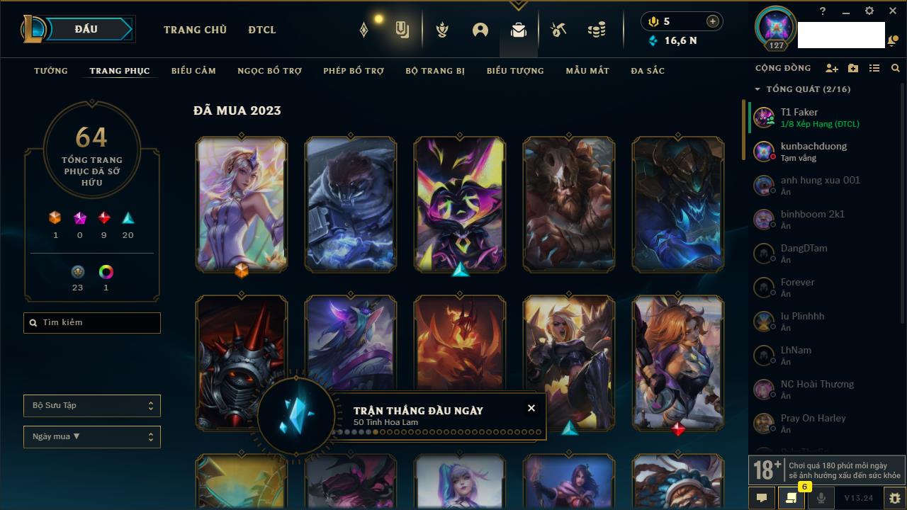 Rank Đơn: Chưa RankKhung: Chưa có khungTướng: 161 - Còn 4964 THXTrang Phục: 151Rank ĐTCL: Chưa RankLinh Thú: 175