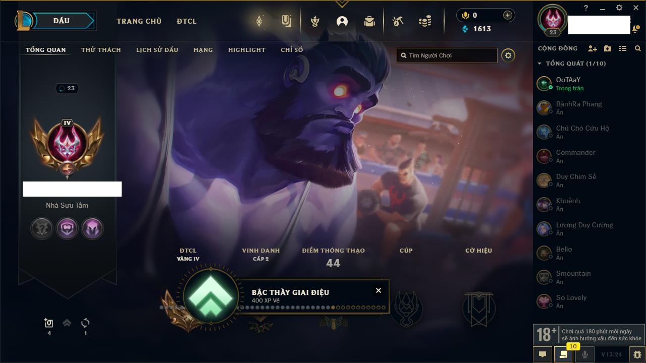 Rank Đơn: Chưa rank mùa nàoKhung: Chưa có khungTướng: 36 - Còn 190 THXTrang Phục: 14Rank ĐTCL: Chưa RankLinh Thú: 65