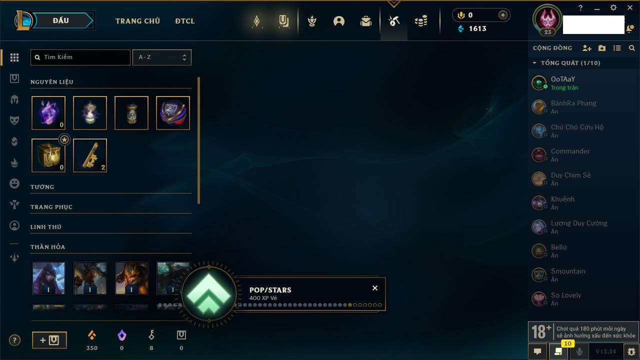 Rank Đơn: Chưa rank mùa nàoKhung: Chưa có khungTướng: 12 - Còn 3853 THXTrang Phục: 2Rank ĐTCL: Chưa RankLinh Thú: 30