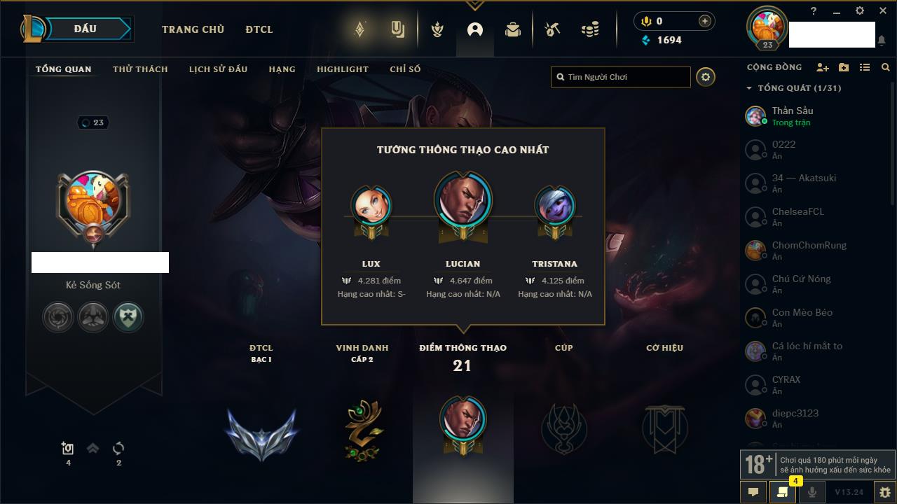 Rank Đơn: Chưa rank mùa nàoKhung: Chưa có khungTướng: 24 - Còn 30580 THXTrang Phục: 4Rank ĐTCL: Bạch Kim IIILinh Thú: 122