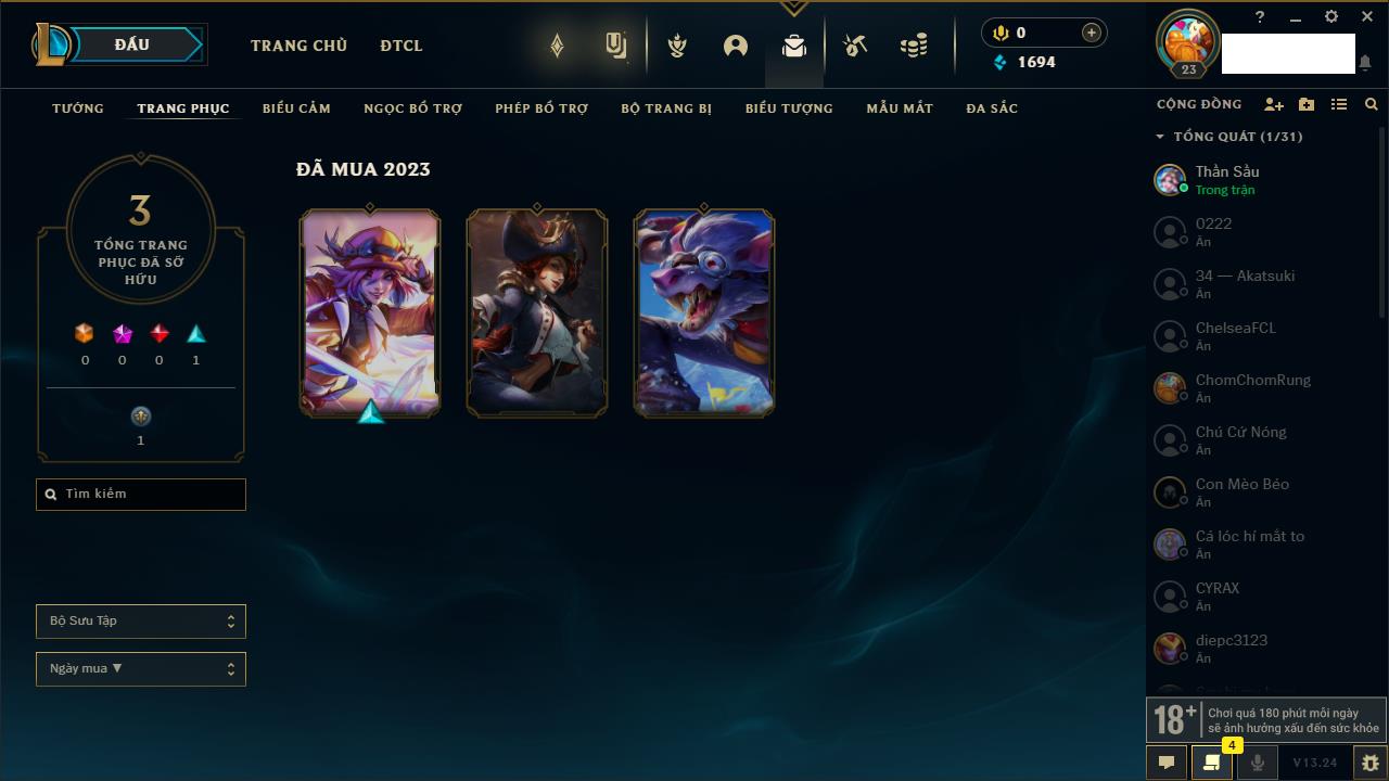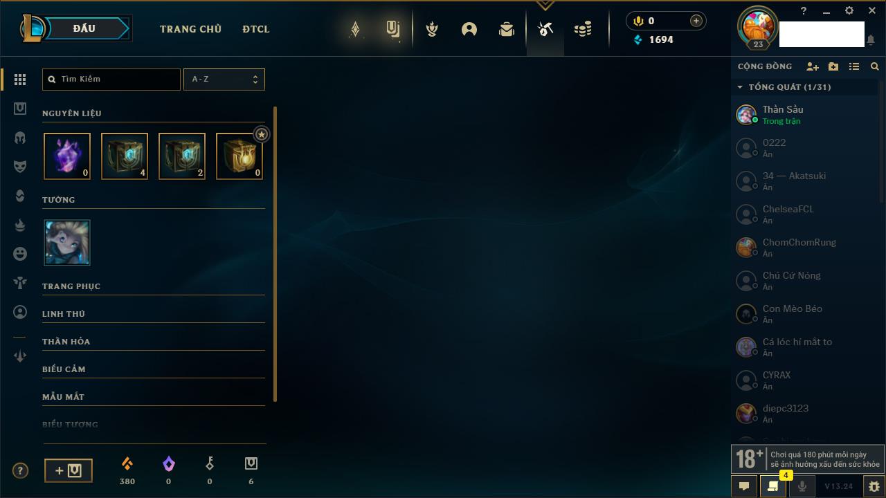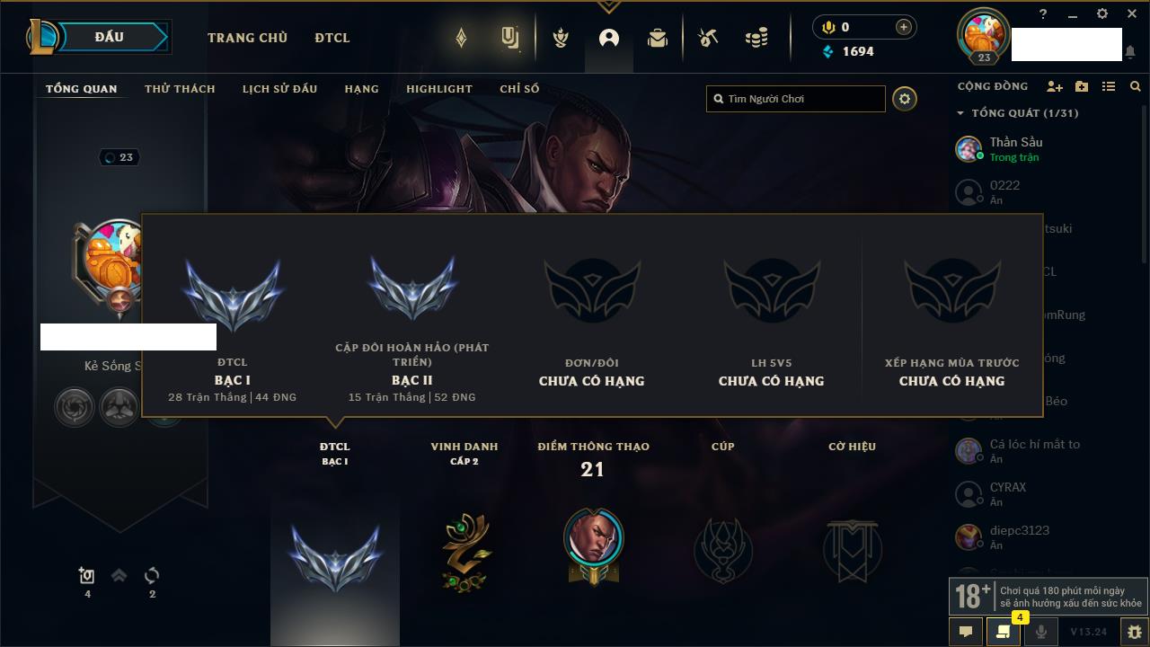 Rank Đơn: Chưa RankKhung: Chưa có khungTướng: 165 - Còn 3214 THXTrang Phục: 160Rank ĐTCL: Chưa RankLinh Thú: 28