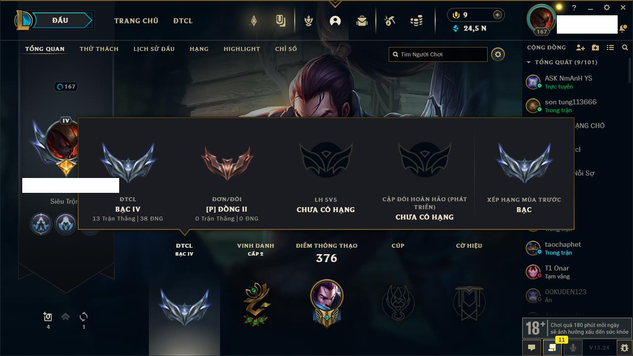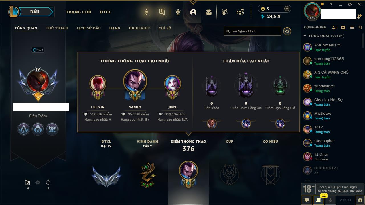 Rank Đơn: Chưa RankKhung: Chưa có khungTướng: 148 - Còn 24581 THXTrang Phục: 58Rank ĐTCL: Chưa RankLinh Thú: 18