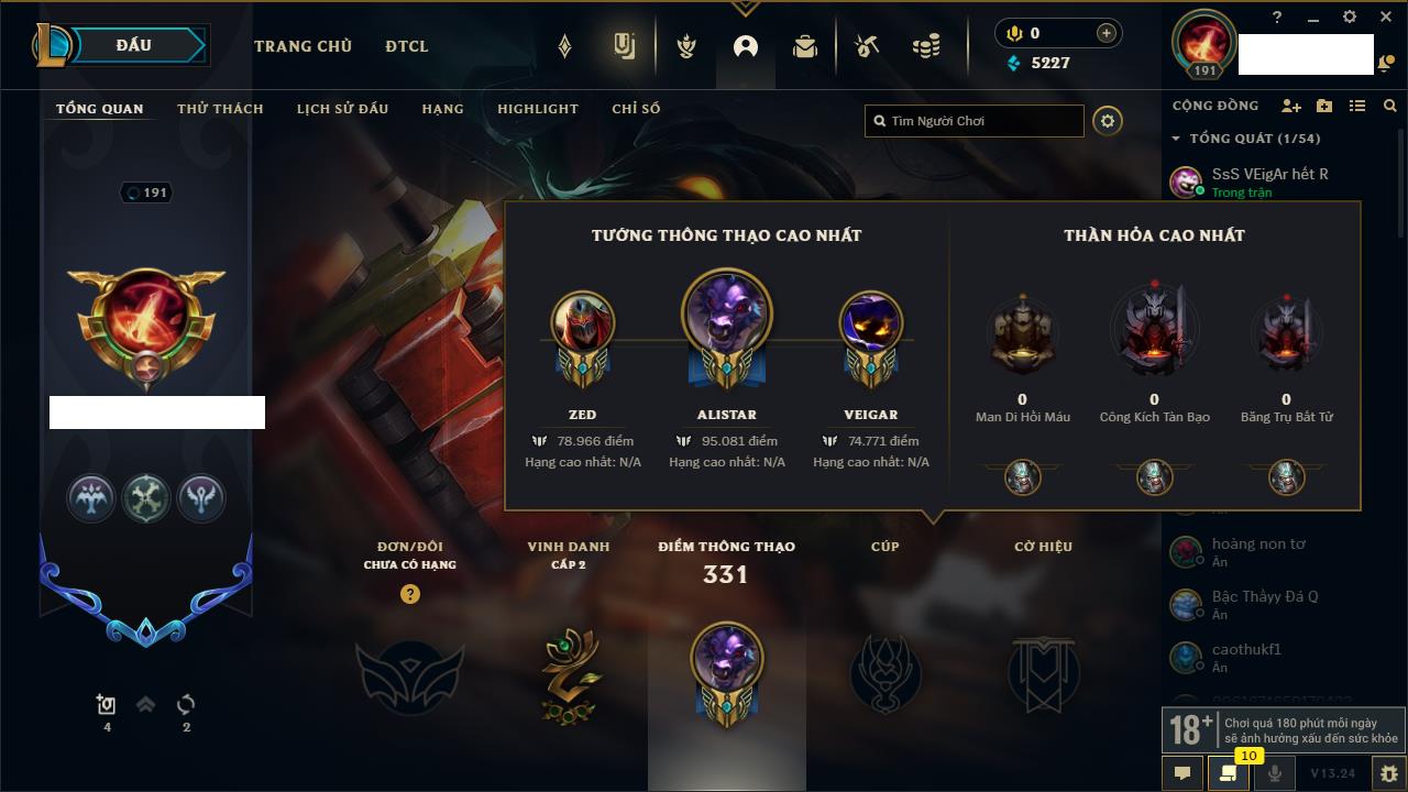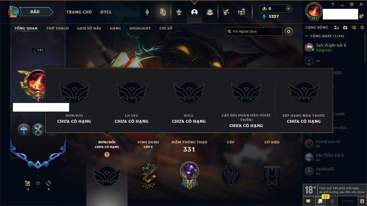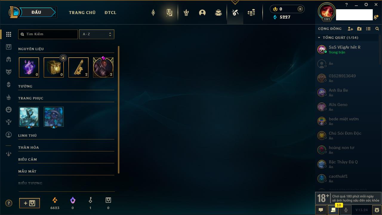 Rank Đơn: Chưa RankKhung: Chưa có khungTướng: 157 - Còn 6232 THXTrang Phục: 60Rank ĐTCL: Chưa RankLinh Thú: 89