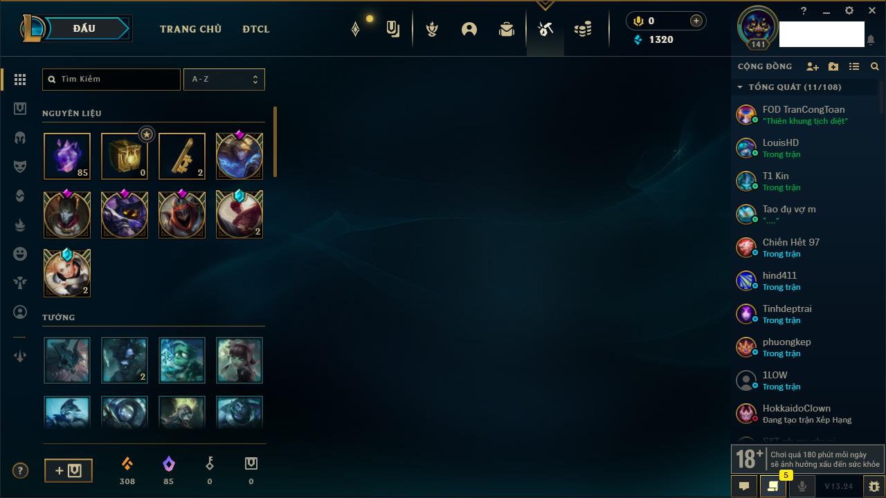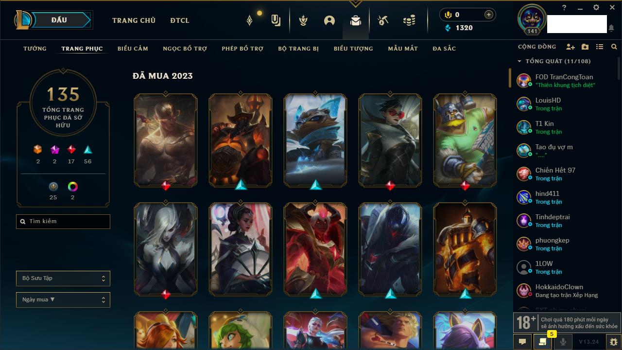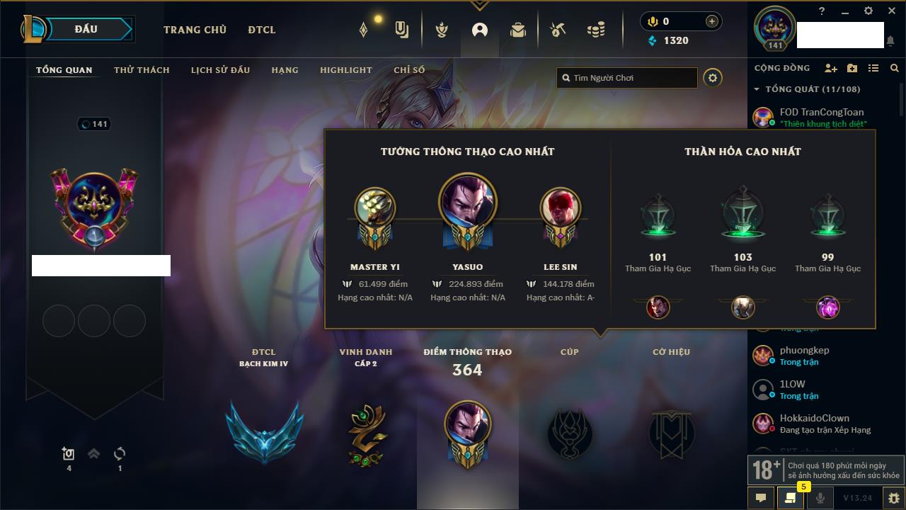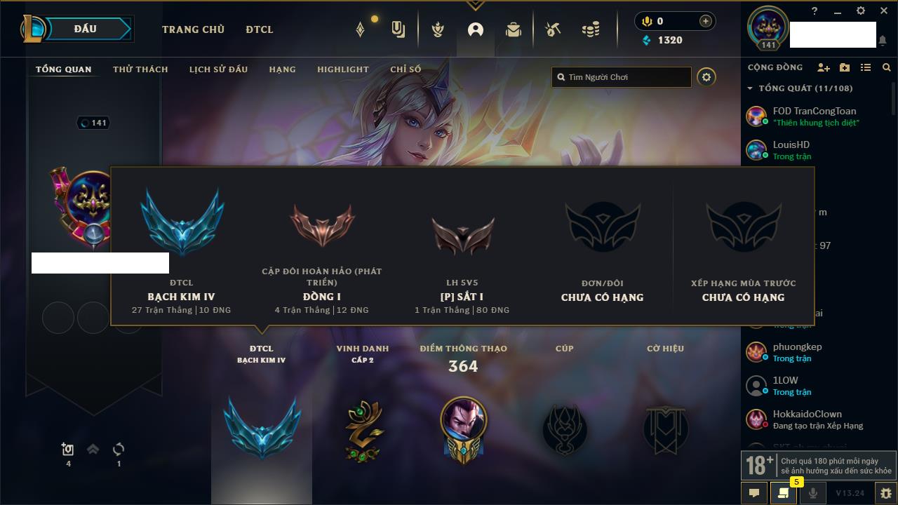 Rank Đơn: Chưa RankKhung: Chưa có khungTướng: 142 - Còn 5252 THXTrang Phục: 131Rank ĐTCL: Chưa RankLinh Thú: 45