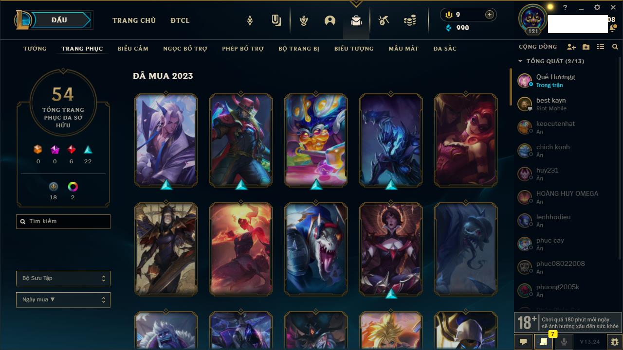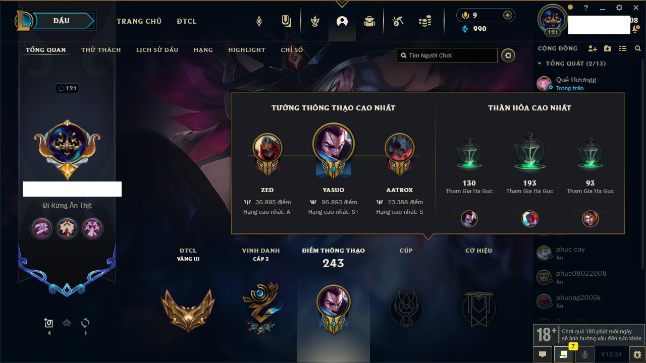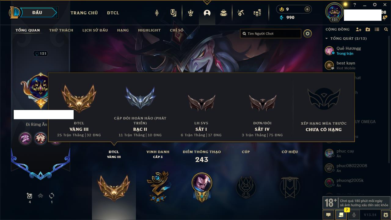 Rank Đơn: Chưa rank mùa nàoKhung: Chưa có khungTướng: 158 - Còn 6970 THXTrang Phục: 32Rank ĐTCL: Chưa RankLinh Thú: 24