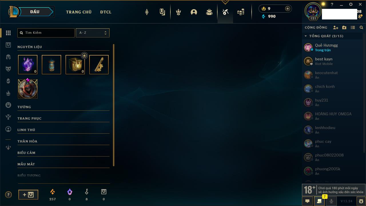 Rank Đơn: Chưa rank mùa nàoKhung: Chưa có khungTướng: 12 - Còn 3853 THXTrang Phục: 2Rank ĐTCL: Chưa RankLinh Thú: 30