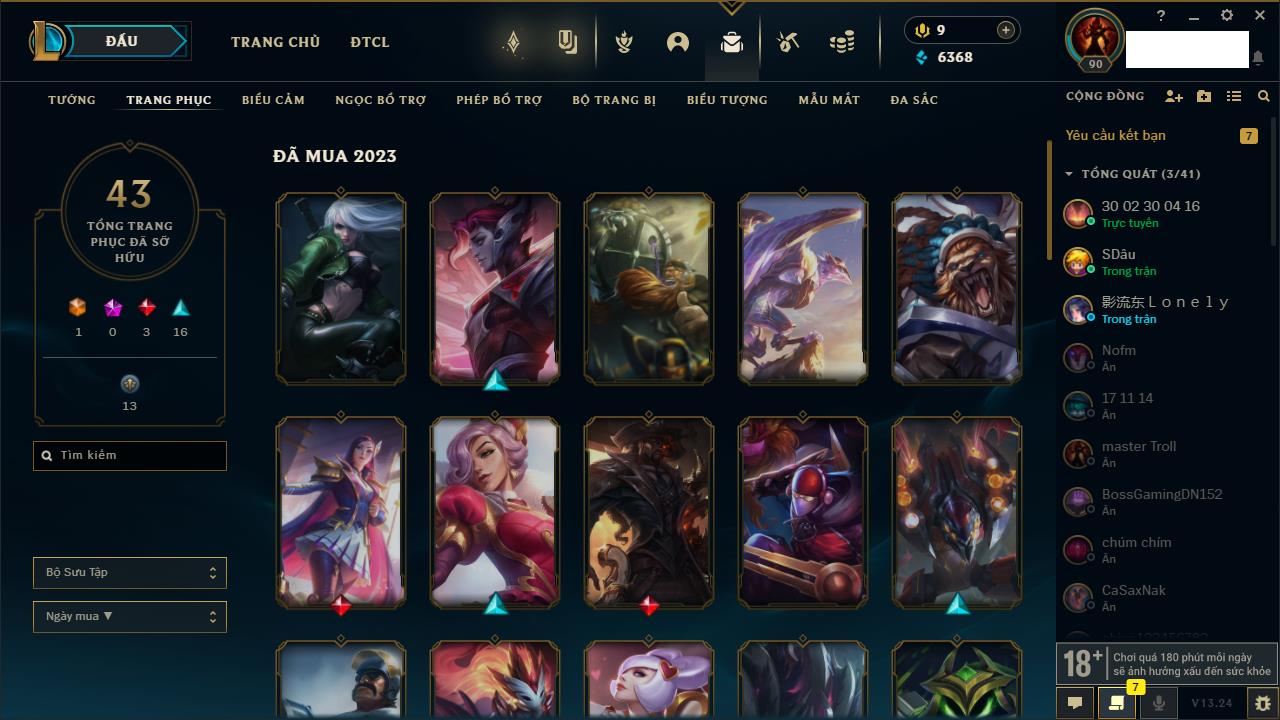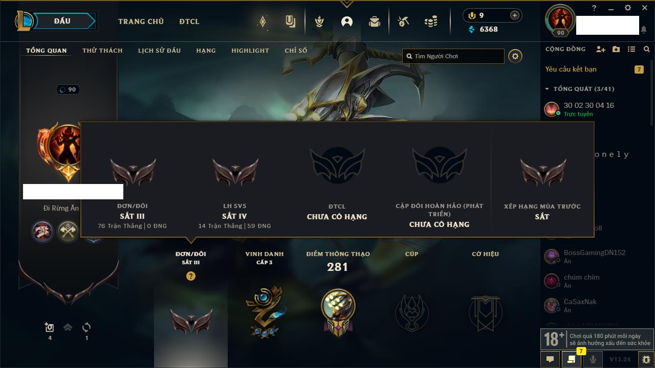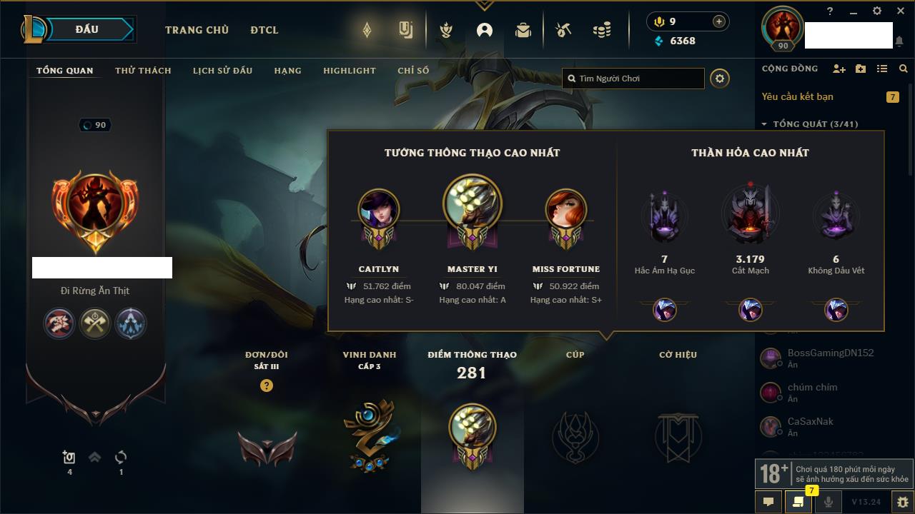 Rank Đơn: Chưa rank mùa nàoKhung: Chưa có khungTướng: 158 - Còn 6970 THXTrang Phục: 32Rank ĐTCL: Chưa RankLinh Thú: 24
