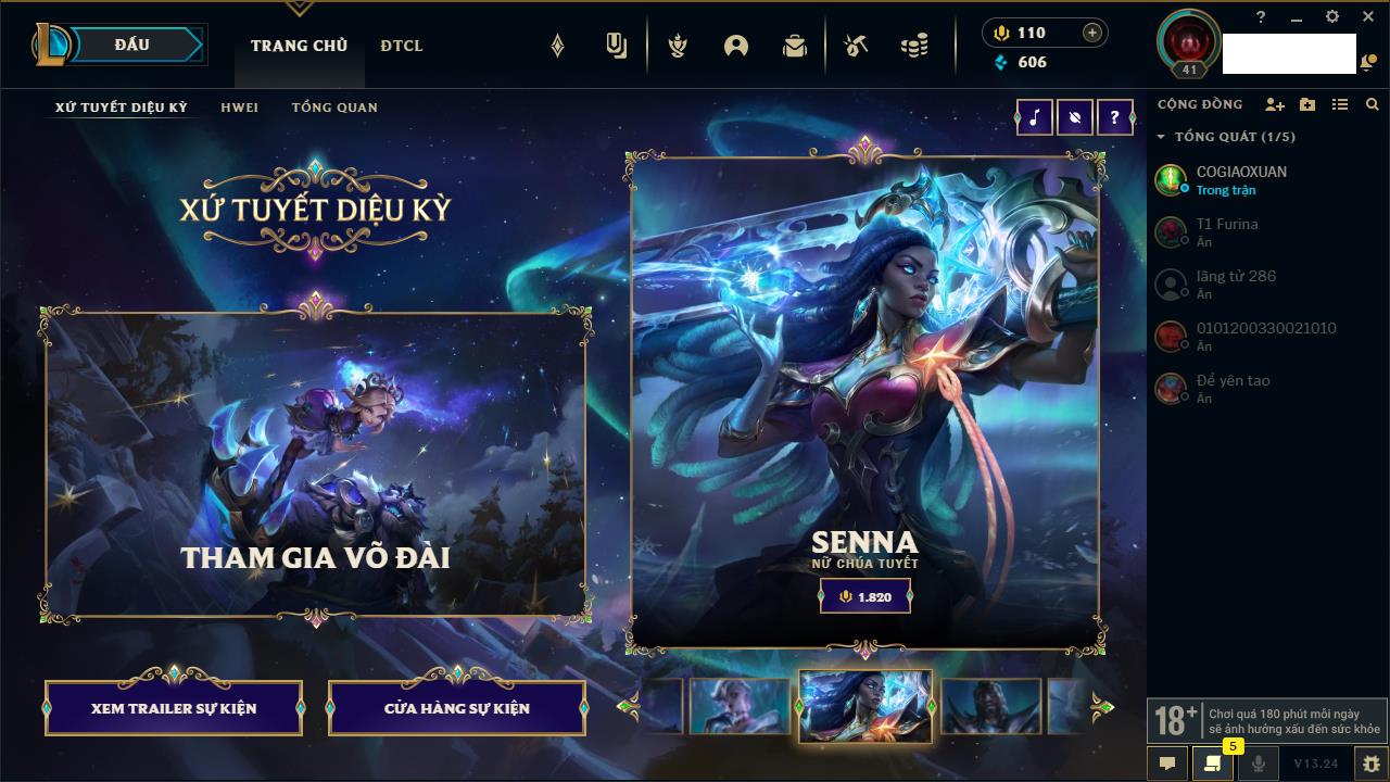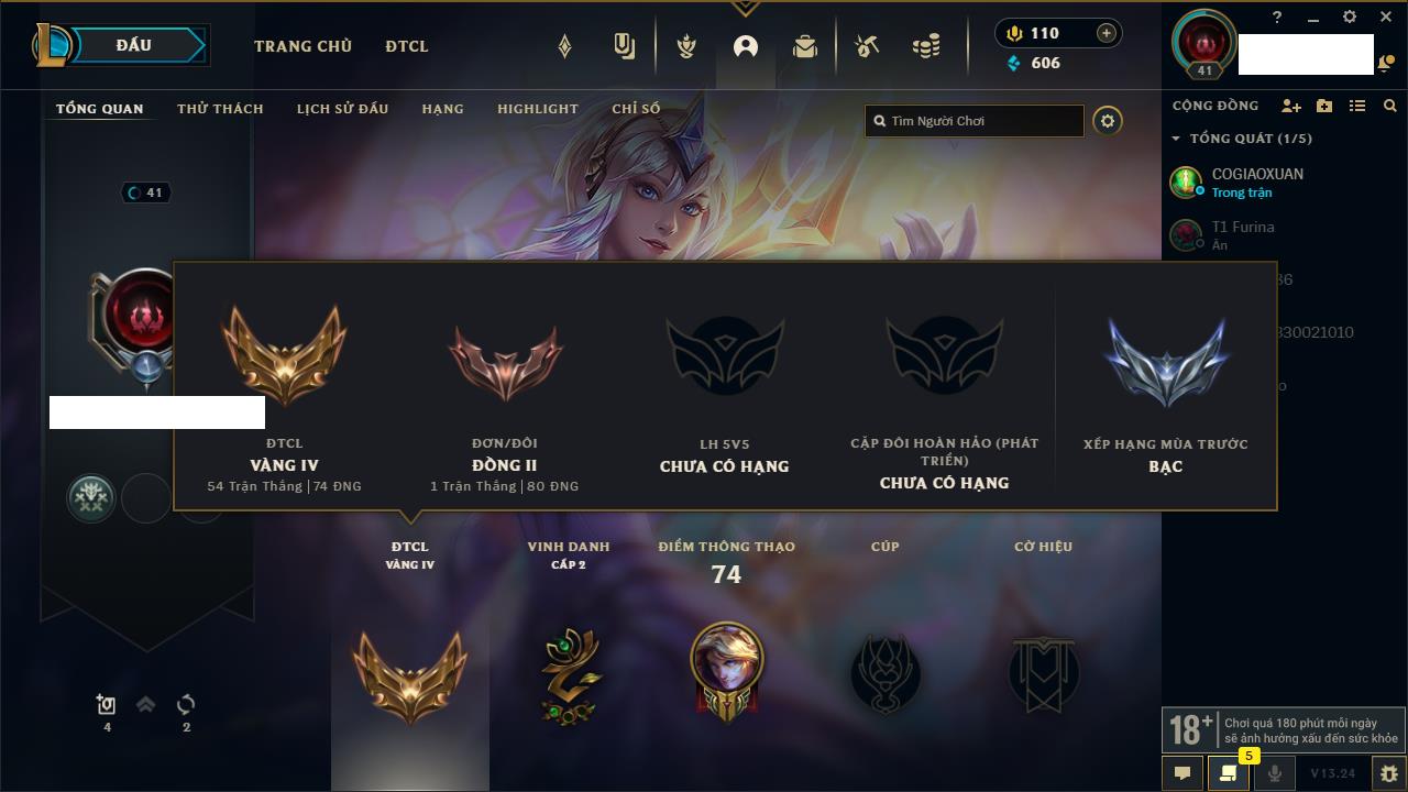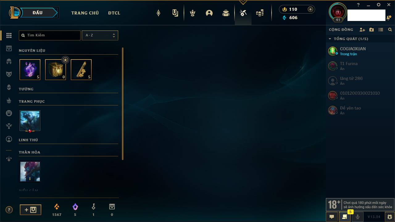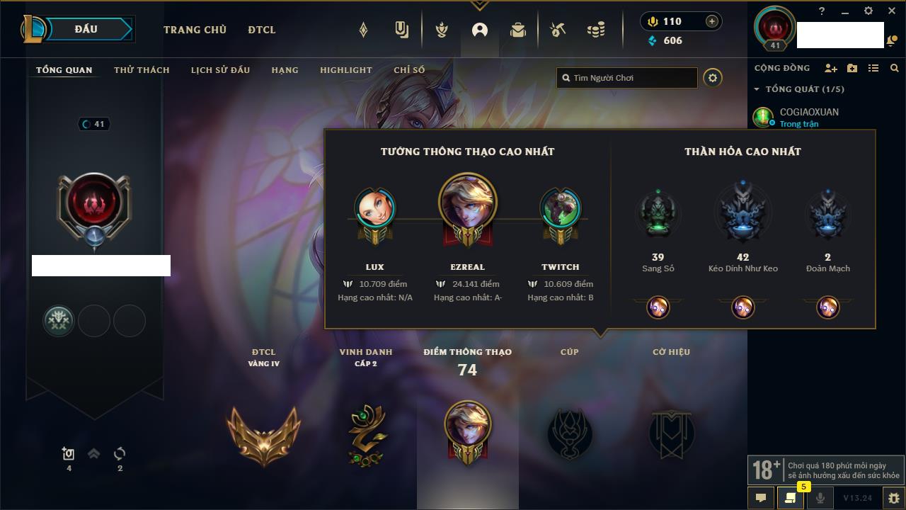 Rank Đơn: Chưa rank mùa nàoKhung: Chưa có khungTướng: 158 - Còn 6970 THXTrang Phục: 32Rank ĐTCL: Chưa RankLinh Thú: 24