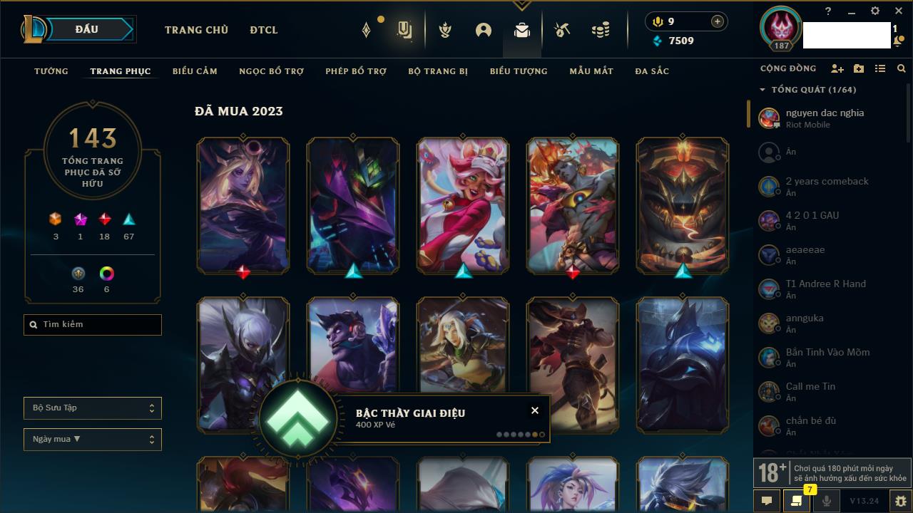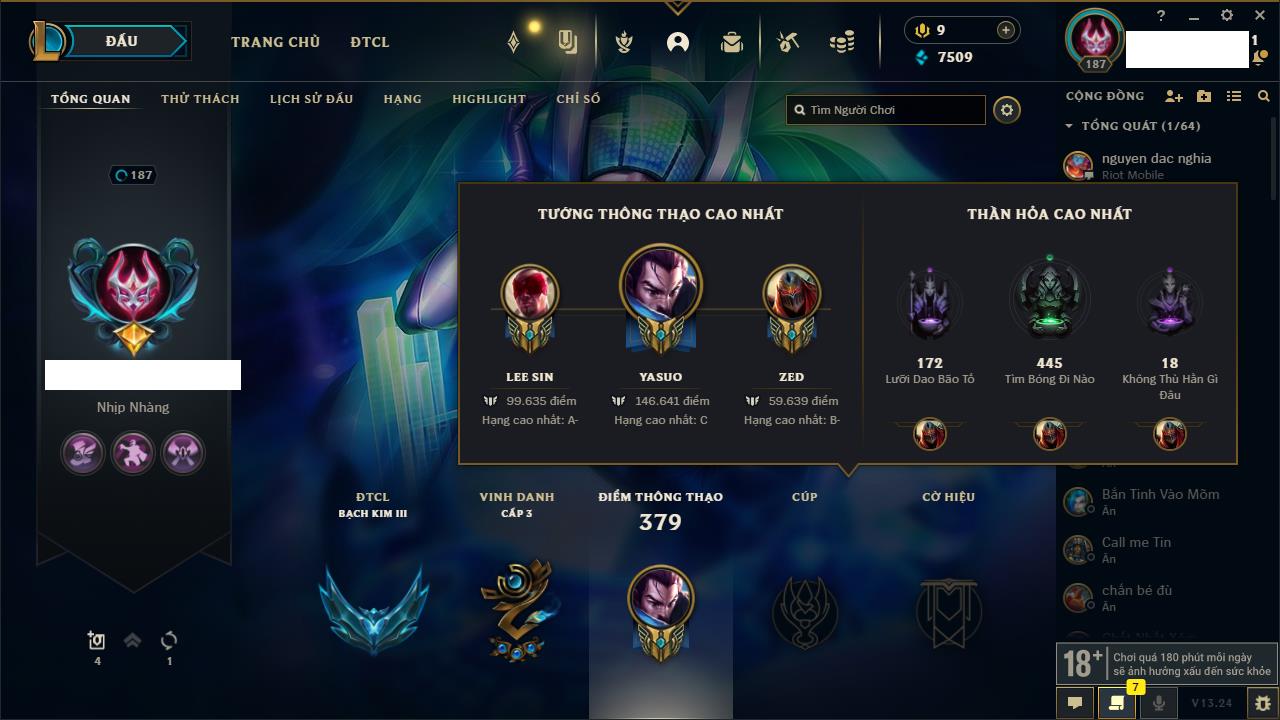 Rank Đơn: Chưa RankKhung: Chưa có khungTướng: 167 - Còn 20912 THXTrang Phục: 154Rank ĐTCL: Chưa RankLinh Thú: 107