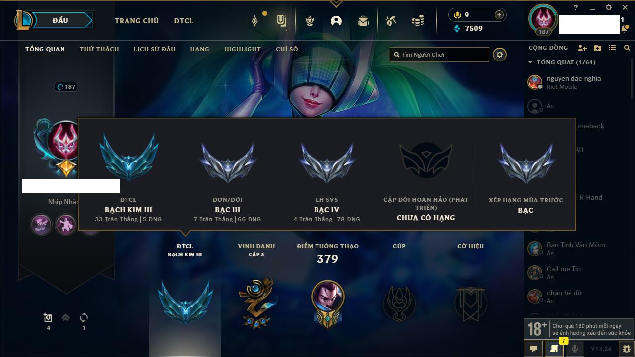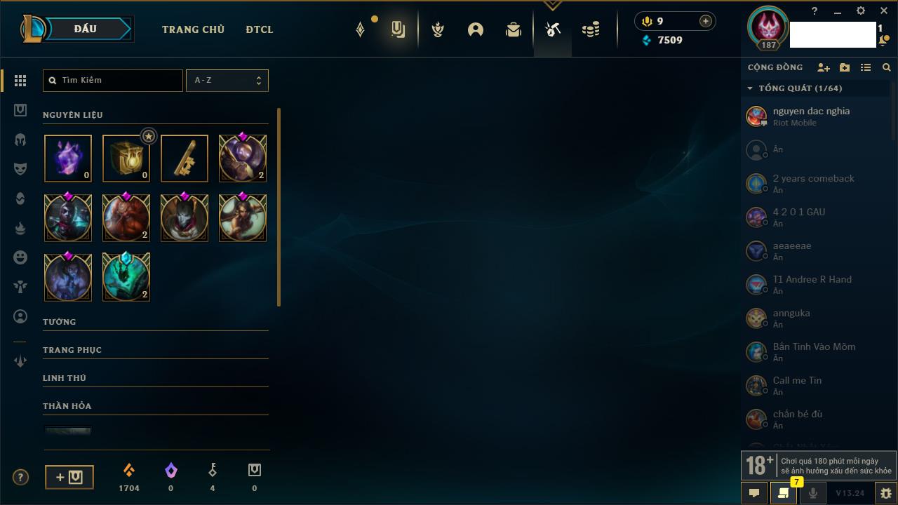 Rank Đơn: Chưa RankKhung: Chưa có khungTướng: 162 - Còn 86599 THXTrang Phục: 147Rank ĐTCL: Chưa RankLinh Thú: 101