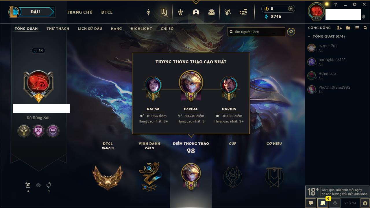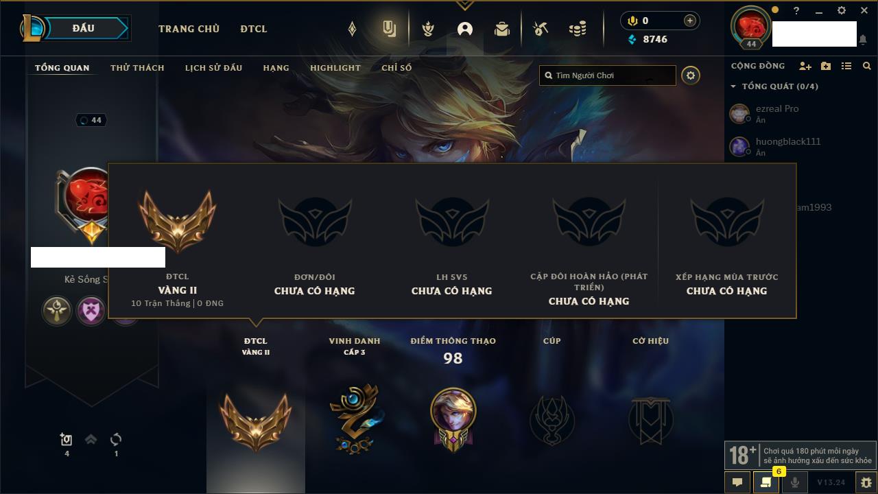 Rank Đơn: Chưa rank mùa nàoKhung: Chưa có khungTướng: 12 - Còn 3853 THXTrang Phục: 2Rank ĐTCL: Chưa RankLinh Thú: 30