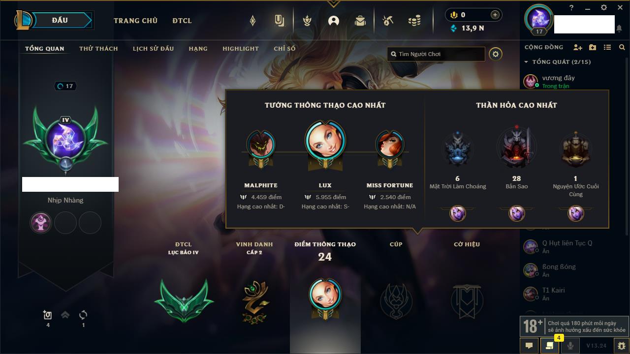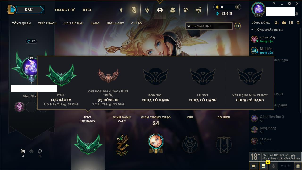 Rank Đơn: Đồng IIKhung: ĐồngTướng: 172 - Còn 35937 THXTrang Phục: 81Rank ĐTCL: Chưa RankLinh Thú: 38