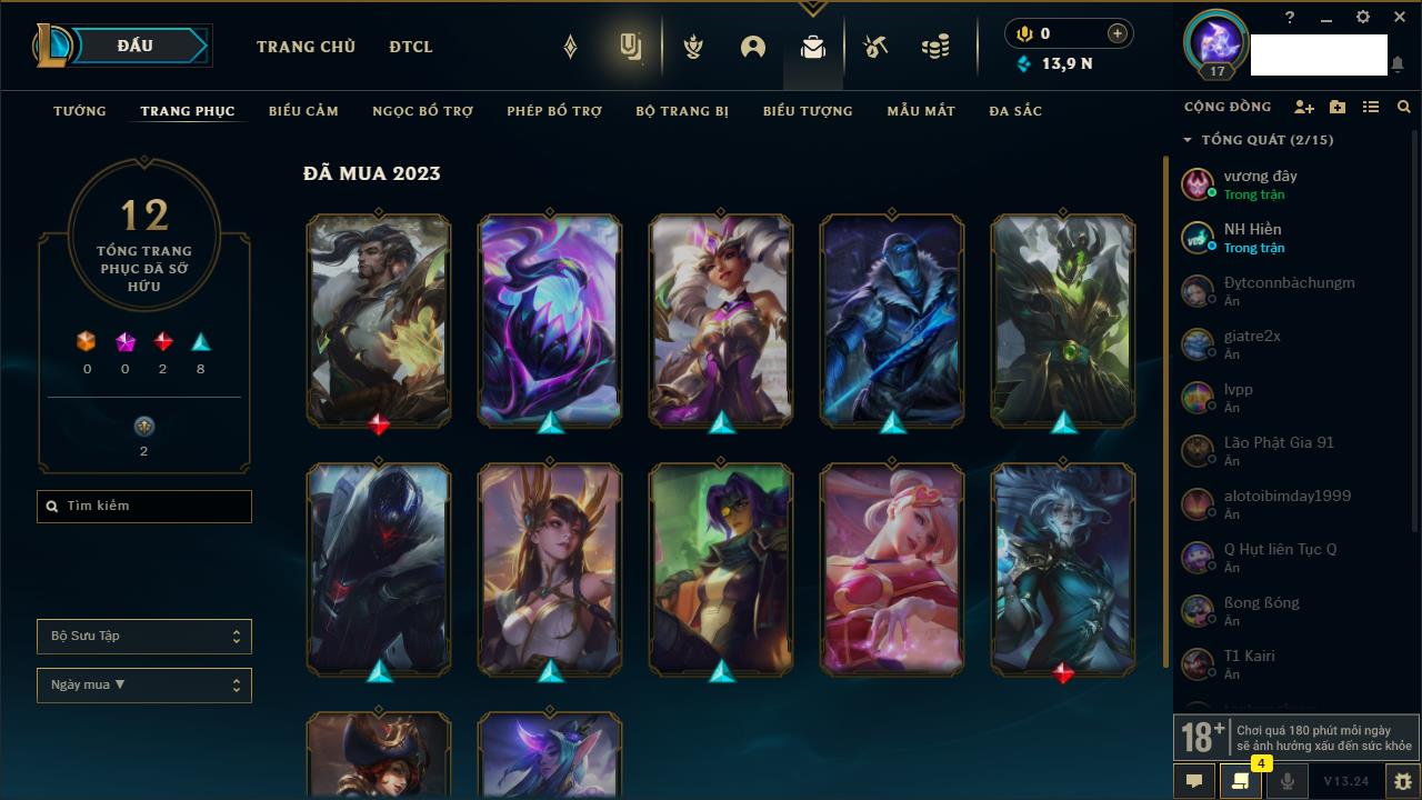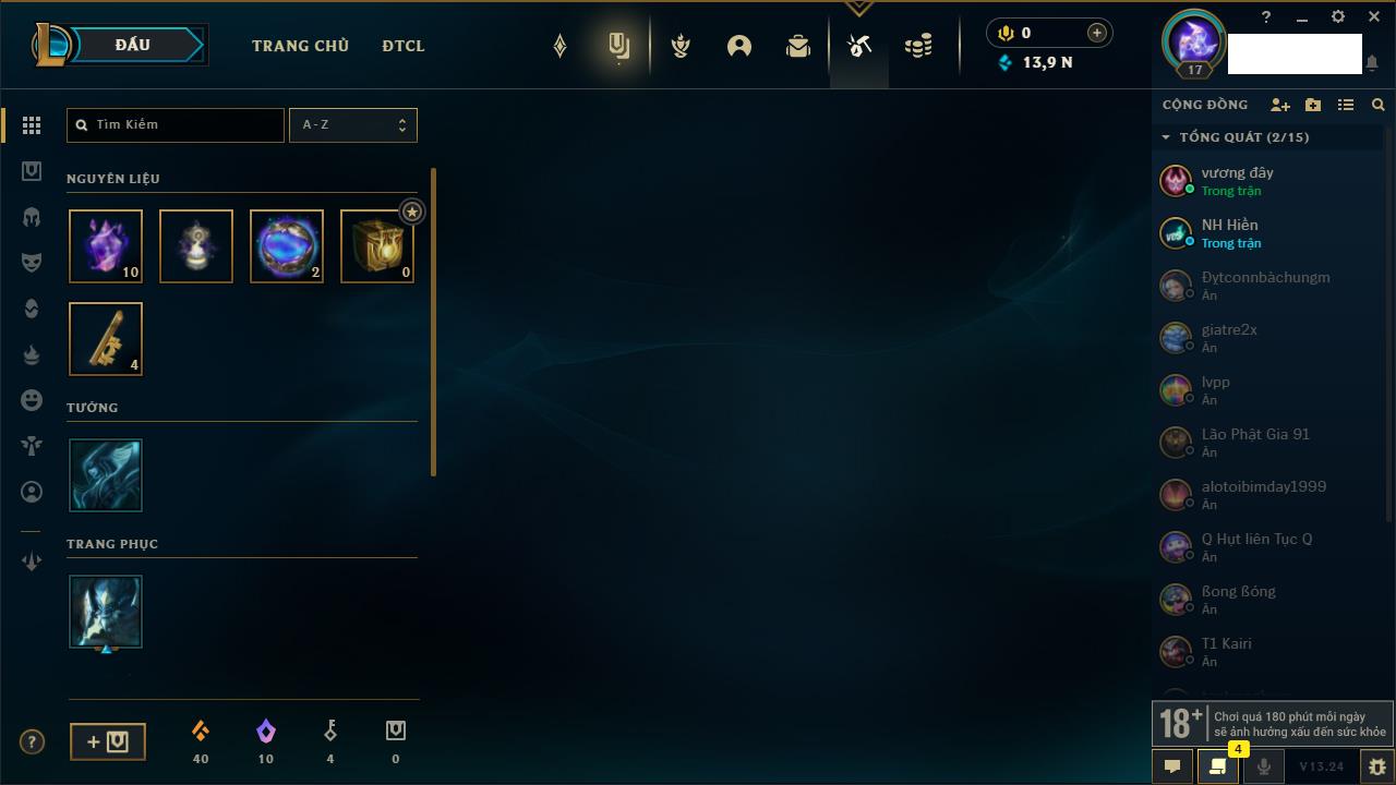 Rank Đơn: Chưa RankKhung: Chưa có khungTướng: 157 - Còn 6232 THXTrang Phục: 60Rank ĐTCL: Chưa RankLinh Thú: 89